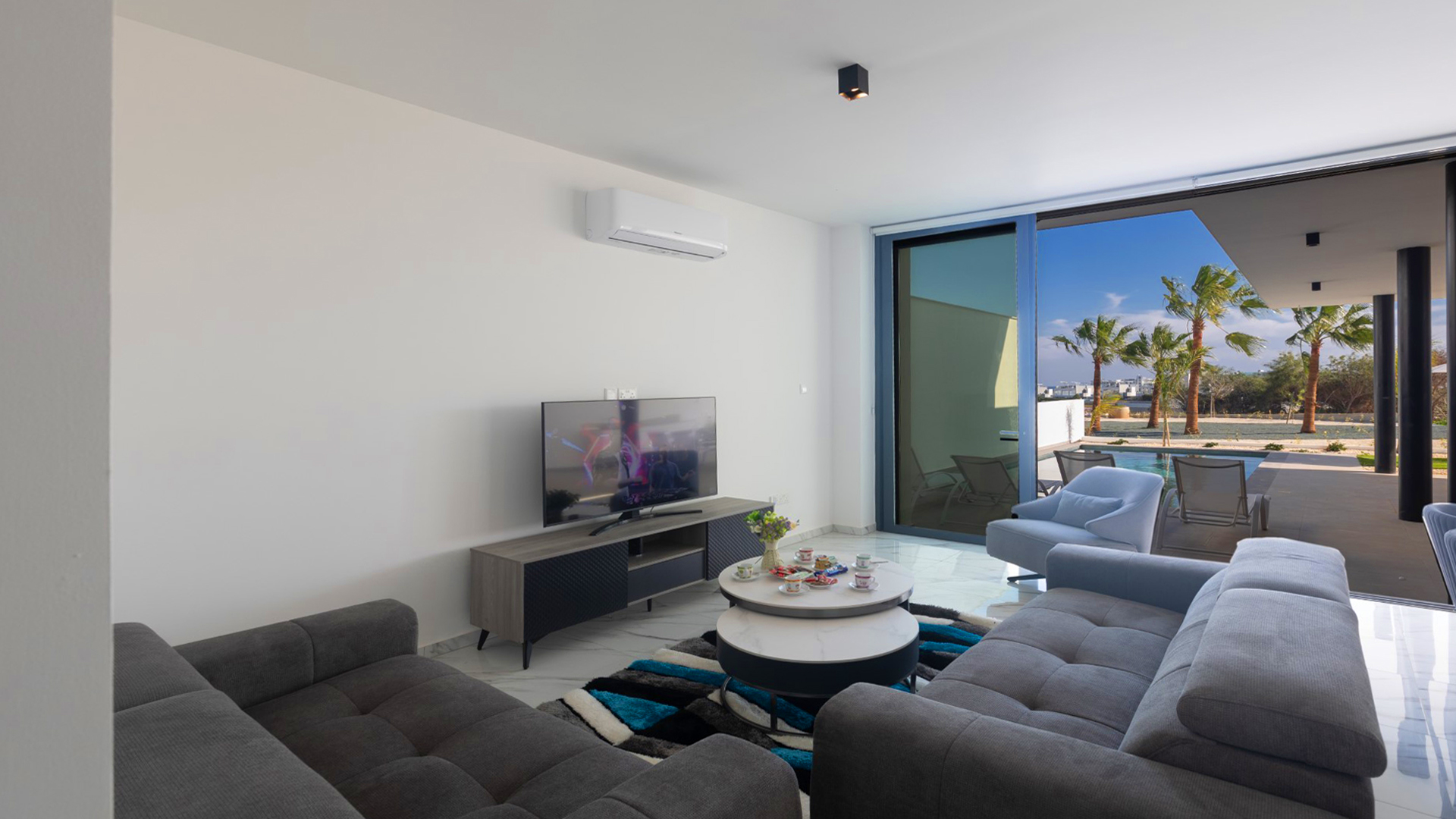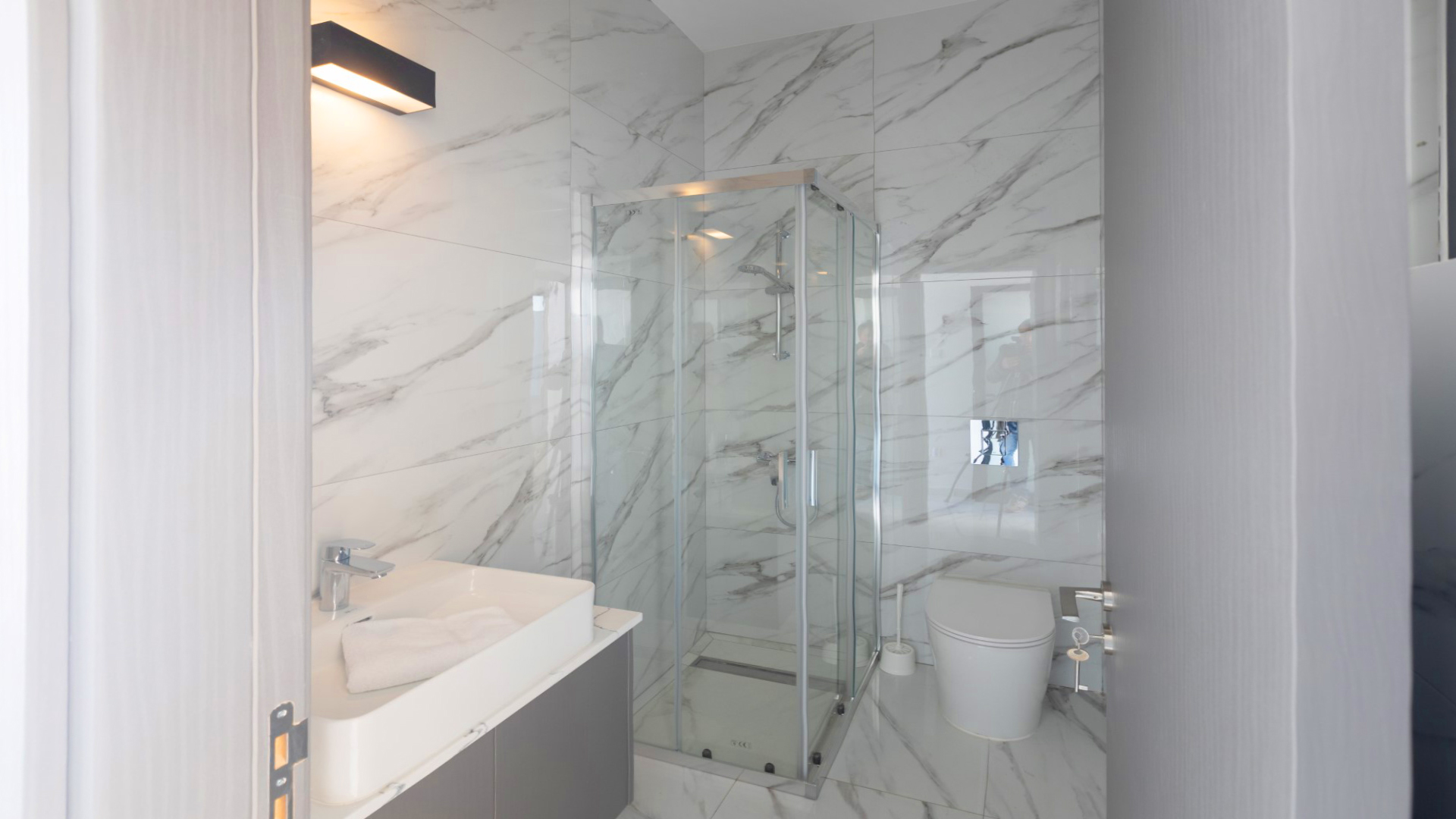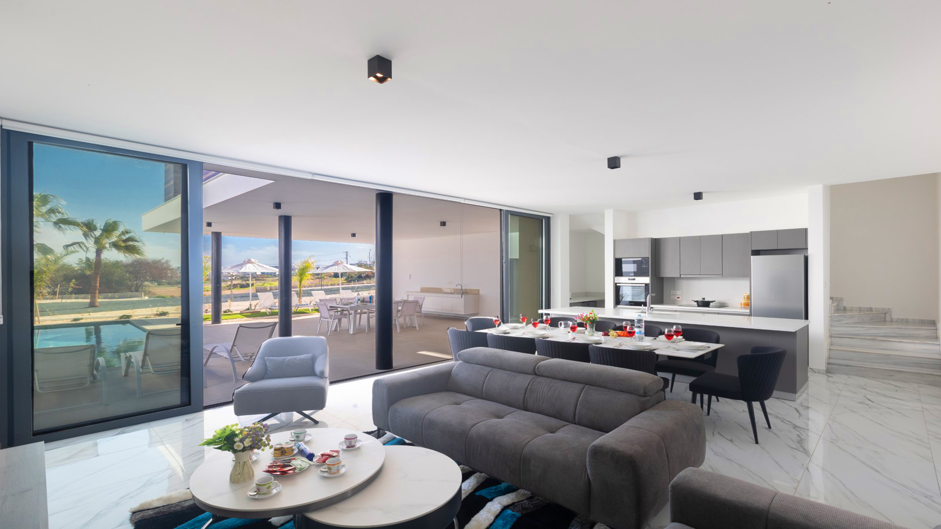 The villa boasts a spacious and beautifully designed open-plan ground floor, where the living room, dining area and fully equipped kitchen flow seamlessly together, creating a bright and welcoming living space. Contemporary finishes, high-quality furnishings and generous natural light enhance the modern feel throughout. For added convenience, a shower and WC are also located on this level.