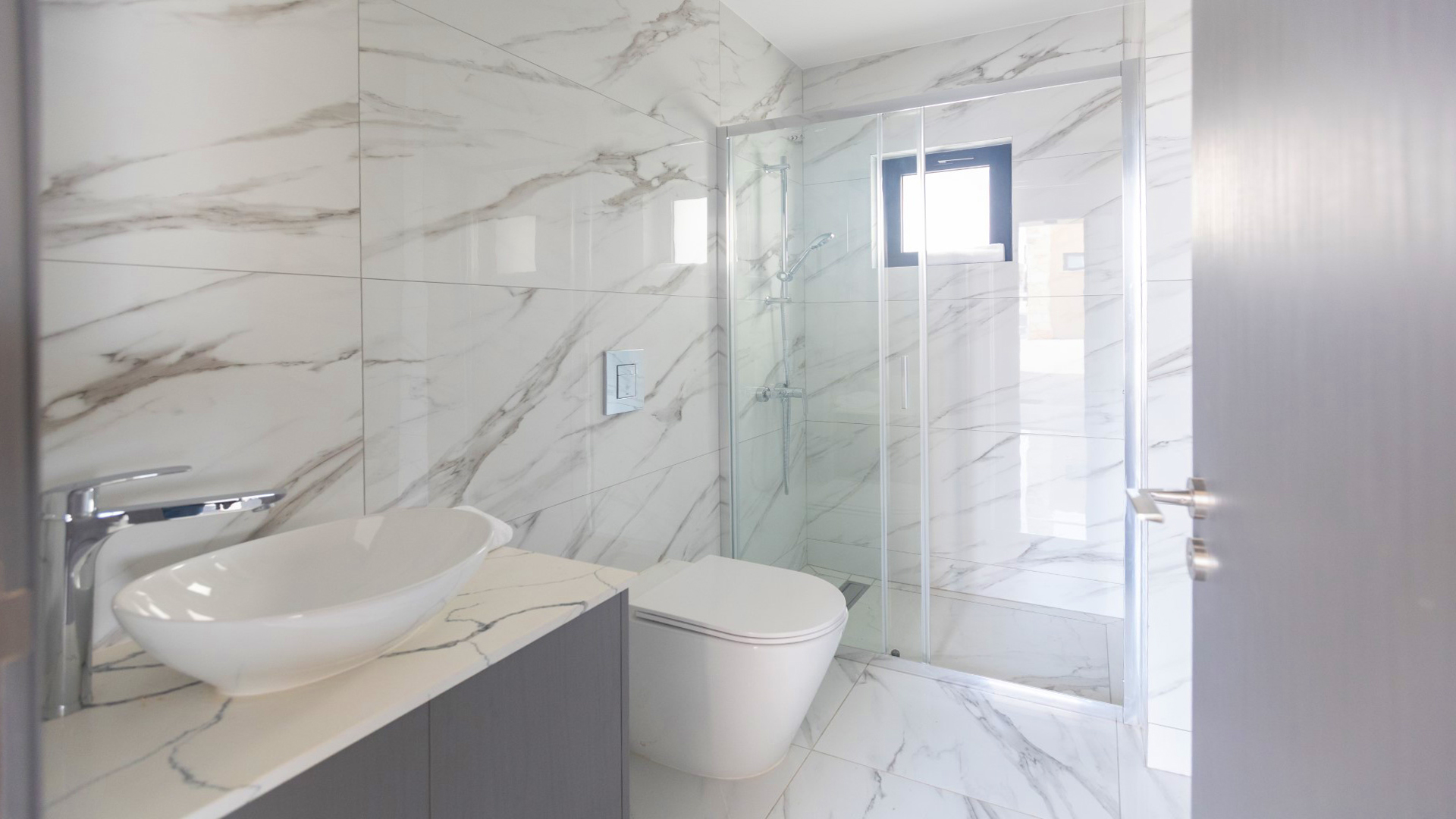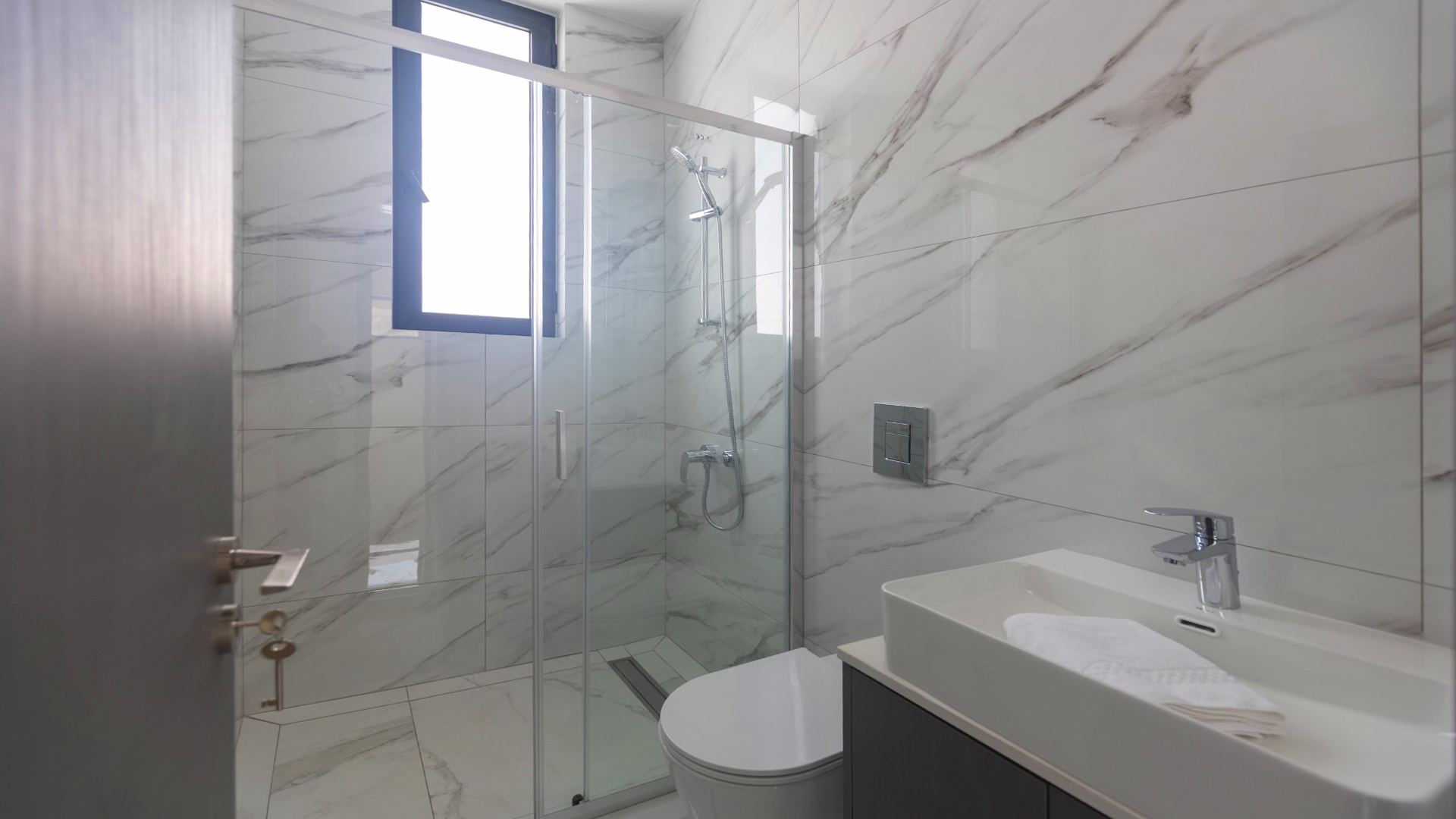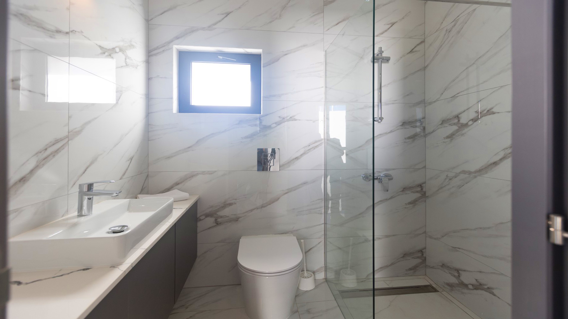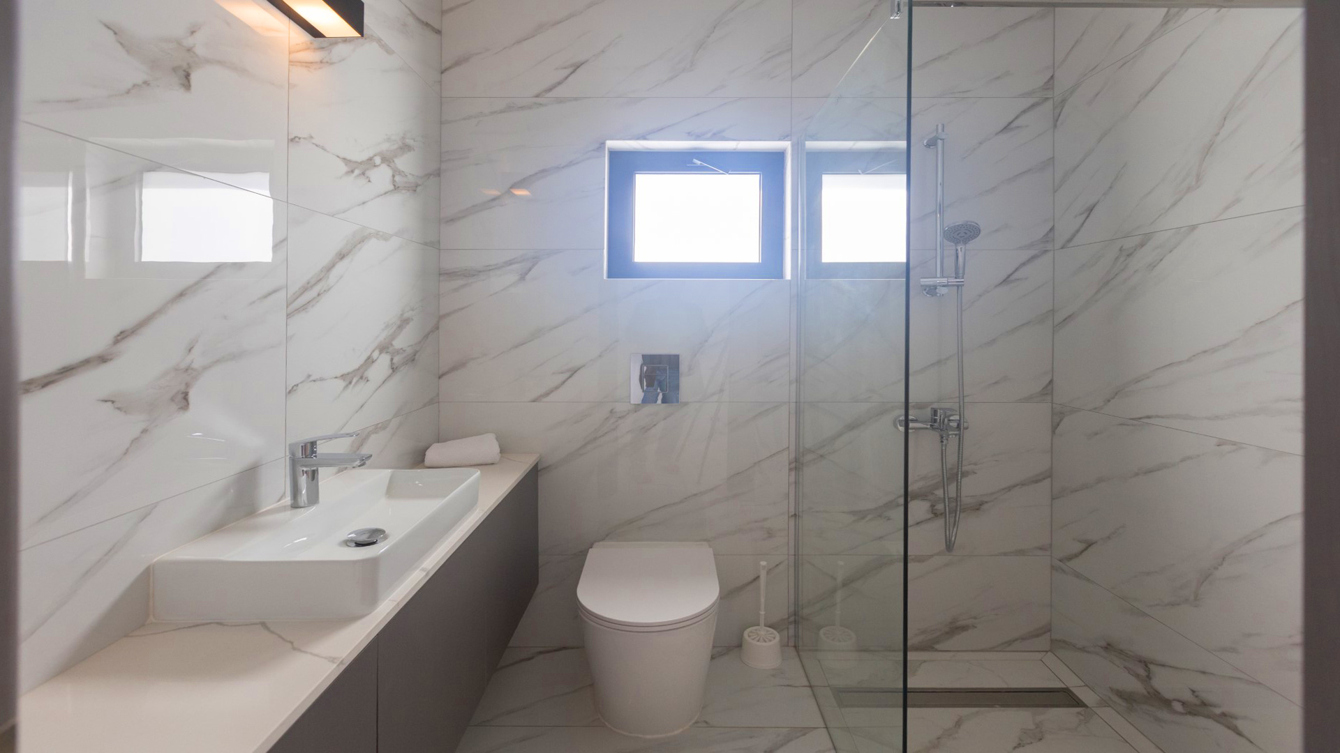The villa boasts a spacious and beautifully designed open-plan ground floor, where the living room, dining area and fully equipped kitchen flow seamlessly together, creating a bright and welcoming living space. Contemporary finishes, high-quality furnishings and generous natural light enhance the modern feel throughout. For added convenience, a shower and WC are also located on this level.