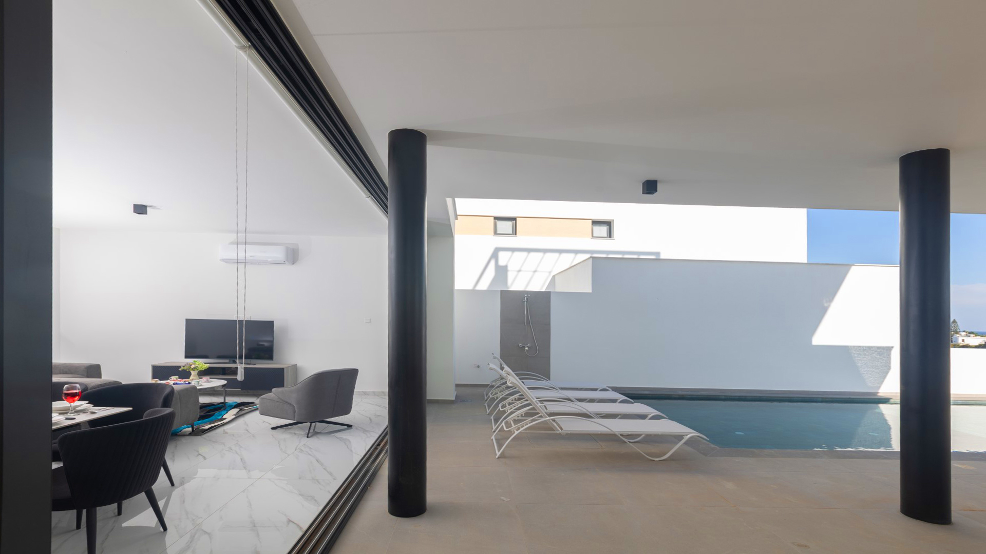 Adding an extra touch of exclusivity, the villa offers a fifth bedroom located separately by the pool. This private room is furnished with single beds and features its own en-suite shower and WC, along with independent access — perfect for guests seeking additional privacy or flexible sleeping arrangements.