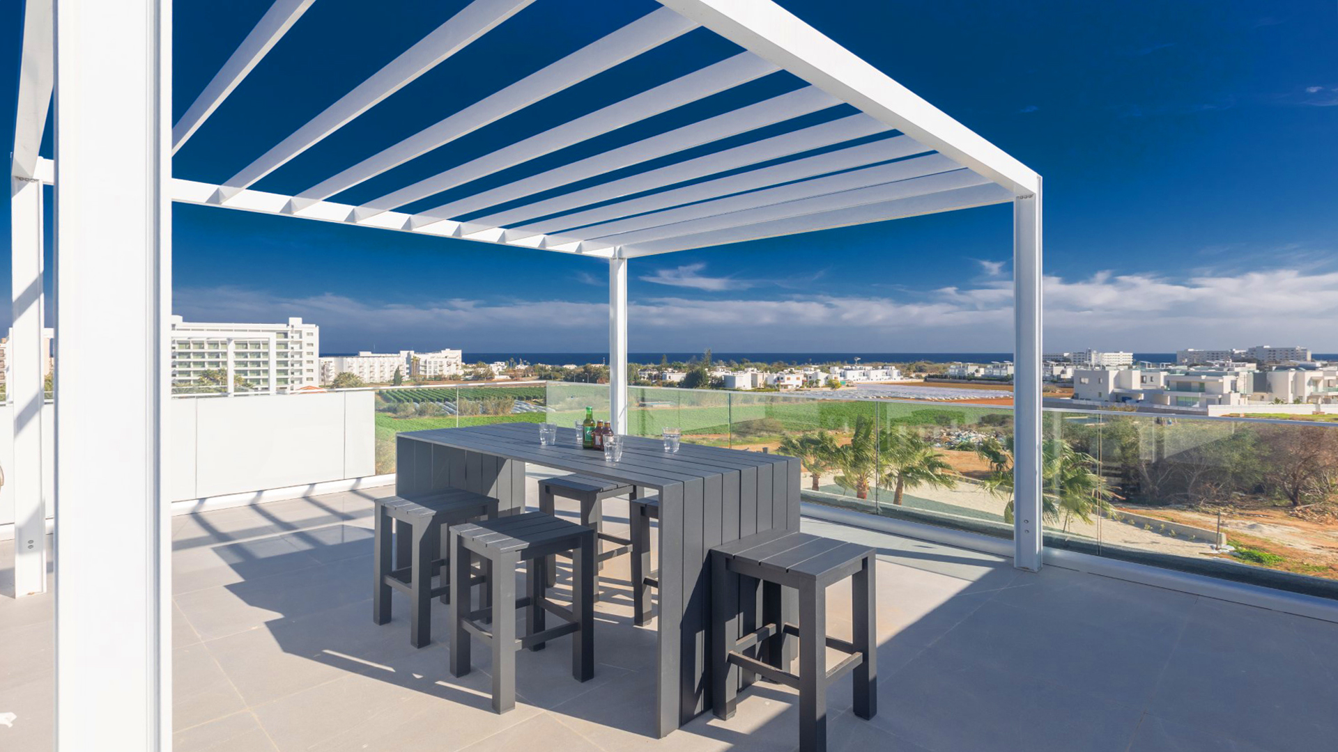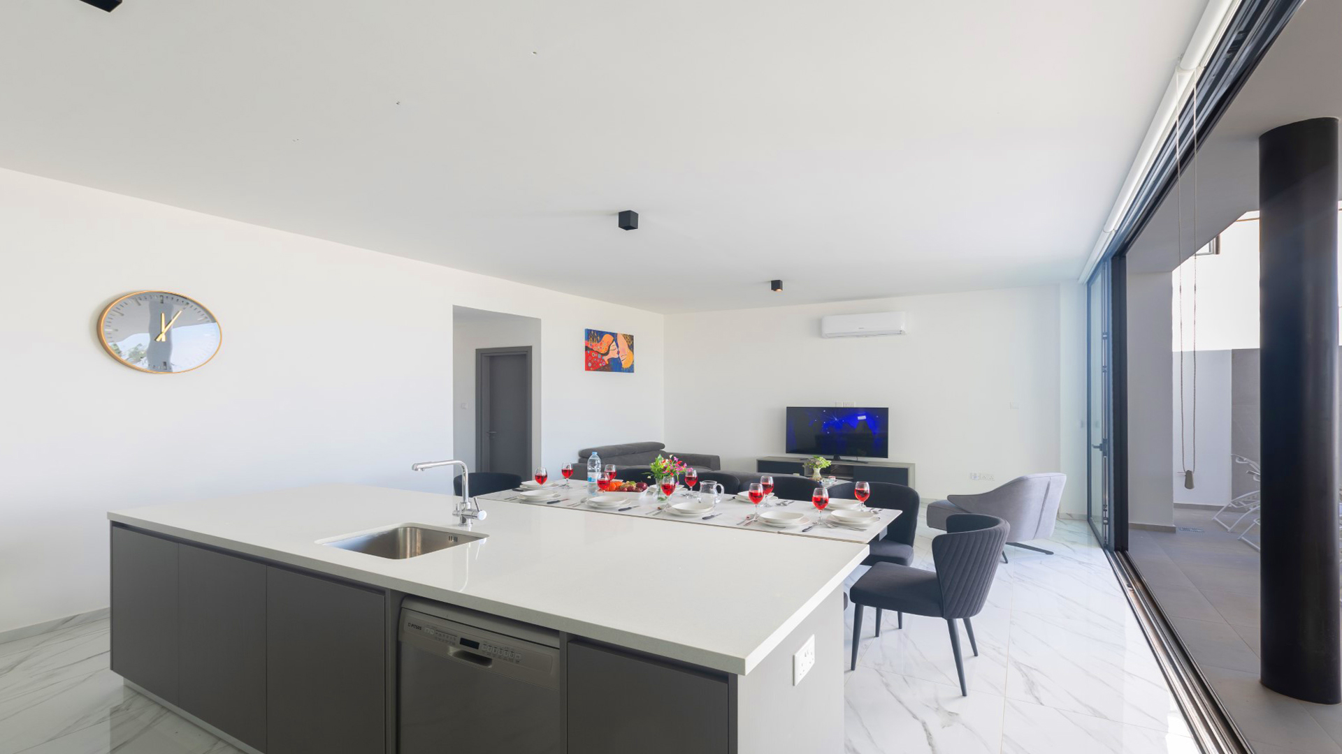 Outside, guests can unwind by the private swimming pool with optional pool heating charged at € 80 per day with a minimum of 5 consecutive days, ideal for enjoying long, sunny days in the Mediterranean climate. The villa also features a beautiful roof garden, offering panoramic views and a peaceful setting to relax, entertain, or enjoy sunset drinks under the Cyprus sky.