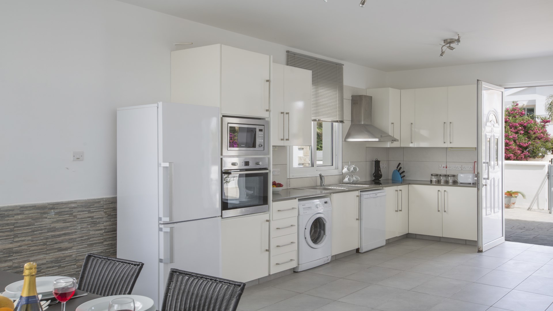 Outside, the villa offers a large private garden and swimming pool, ideal for enjoying the warm Cyprus sunshine. Sun loungers and outdoor furniture provide plenty of space for relaxing, sunbathing and outdoor dining throughout the day.