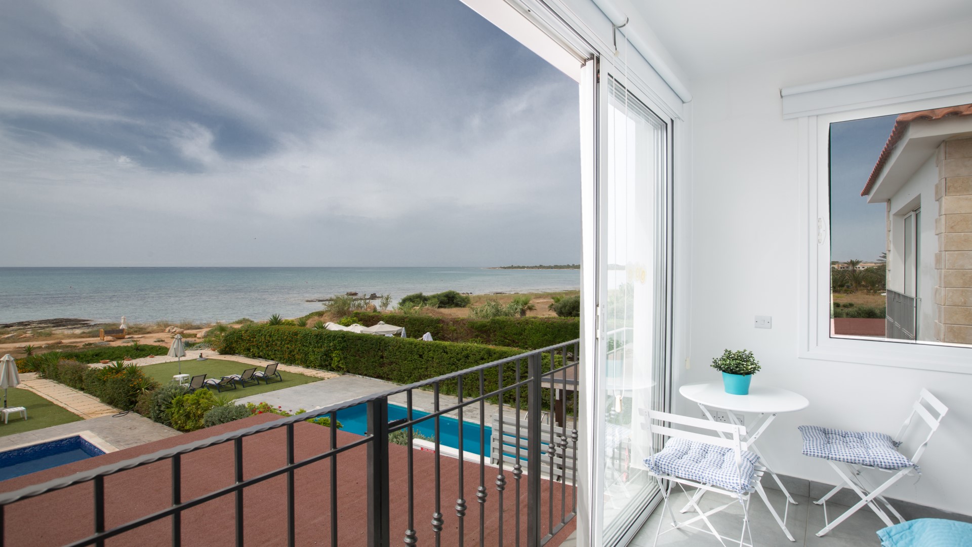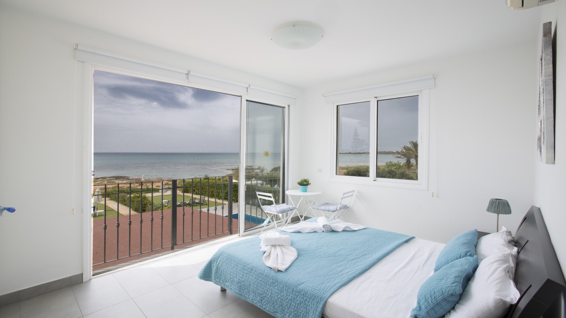 The master bedroom opens onto a private balcony with a seating area, where you can relax and take in the breathtaking panoramic sea views — the perfect spot for morning coffee or sunset drinks.