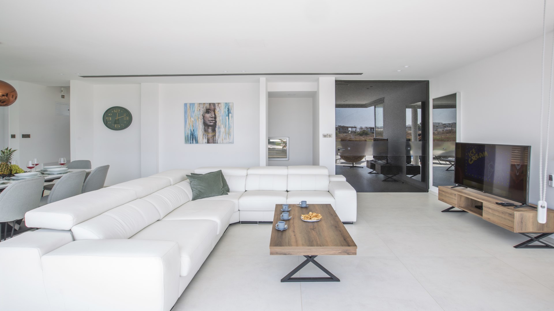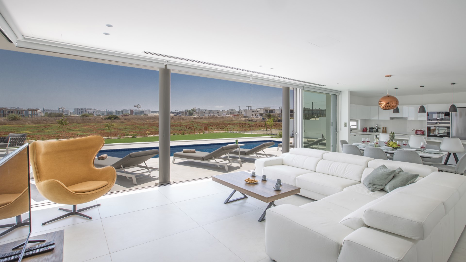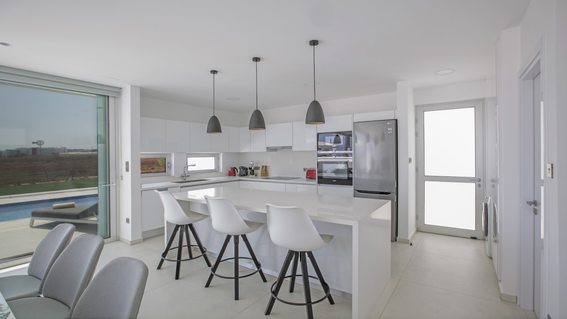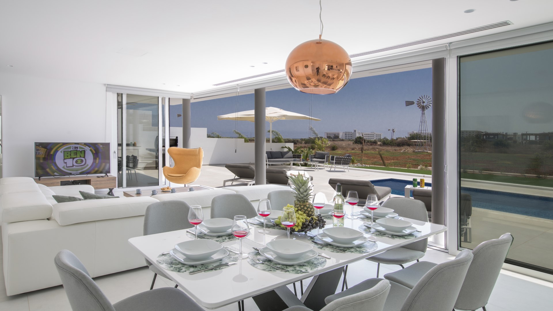 As you walk into the villa, you will find the open-plan living room, kitchen and dining area. The living room features comfortable sofas, a widescreen TV with satellite channels and Wi-Fi connection. The dining area offers seating for 6 people, and the modern kitchen is fully equipped with all appliances required for your self-catering stay, as well as a breakfast bar. The ground floor is surrounded by bi-fold patio doors that open out onto the garden and pool area.