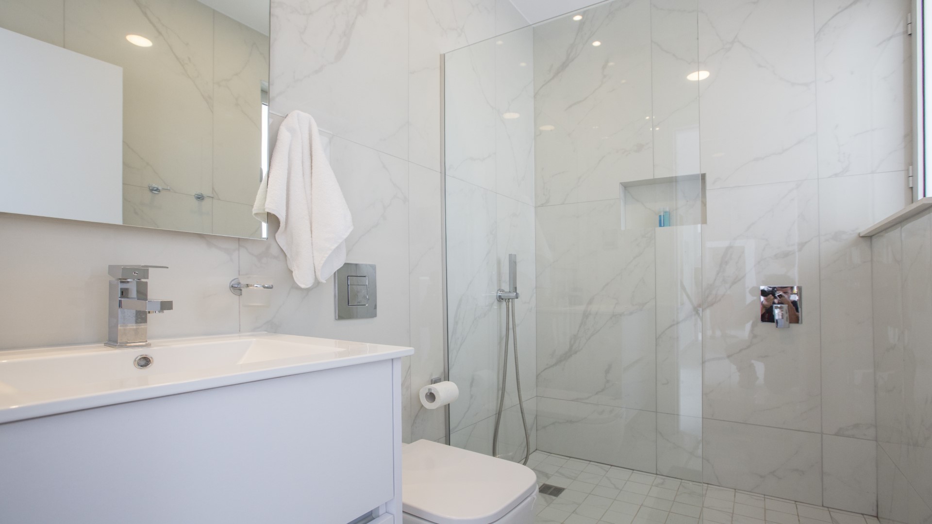 Upstairs, you will find all three bedrooms, all of which offer stunning views. The master double bedroom features a balcony with stunning sea views and an en suite bathroom with shower and WC. Bedroom two has a double bed, while bedroom three has two single beds. All bedrooms are fitted with wardrobes and bedside cabinets. The main family bathroom with shower and WC is also located on this floor.