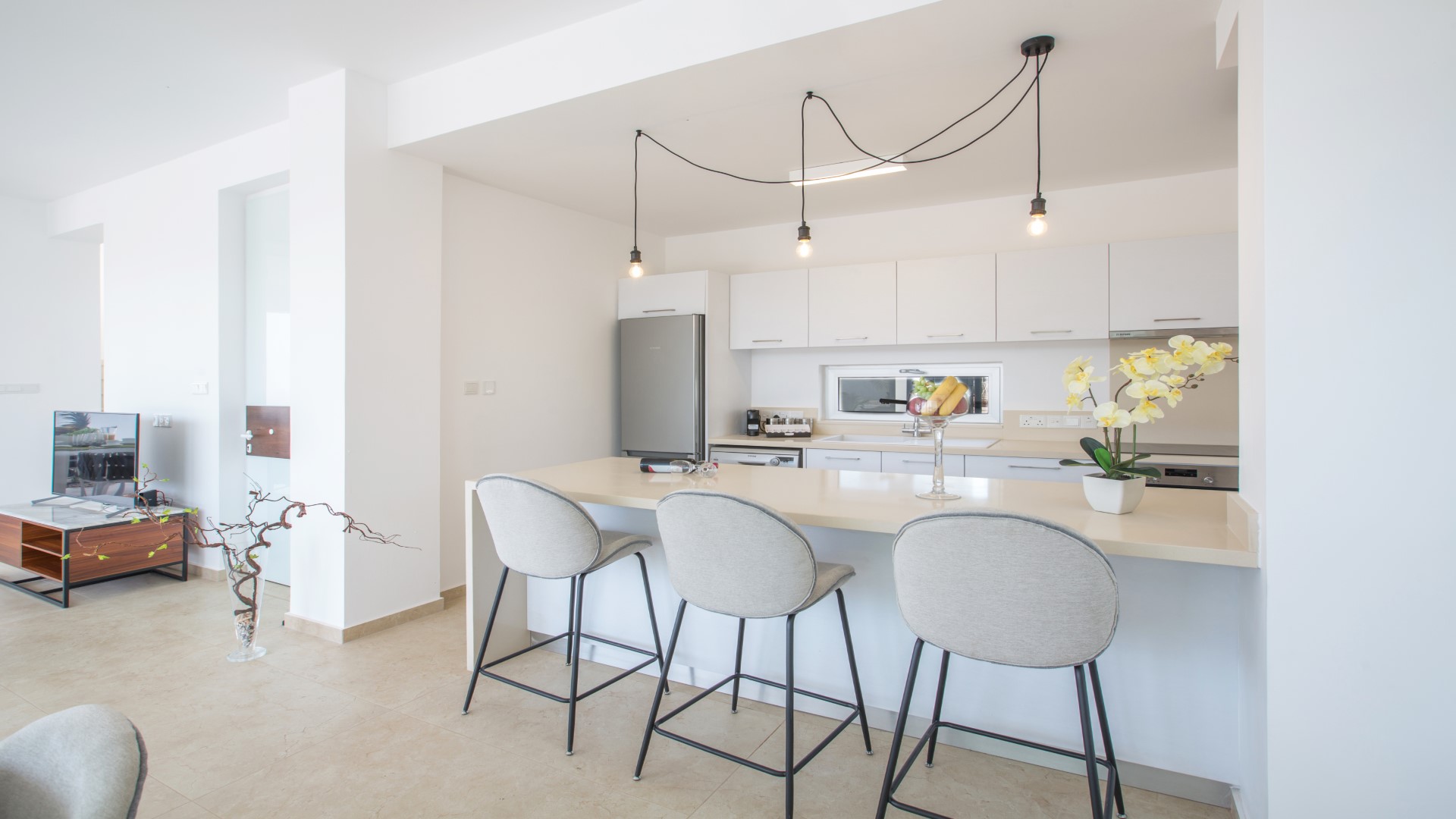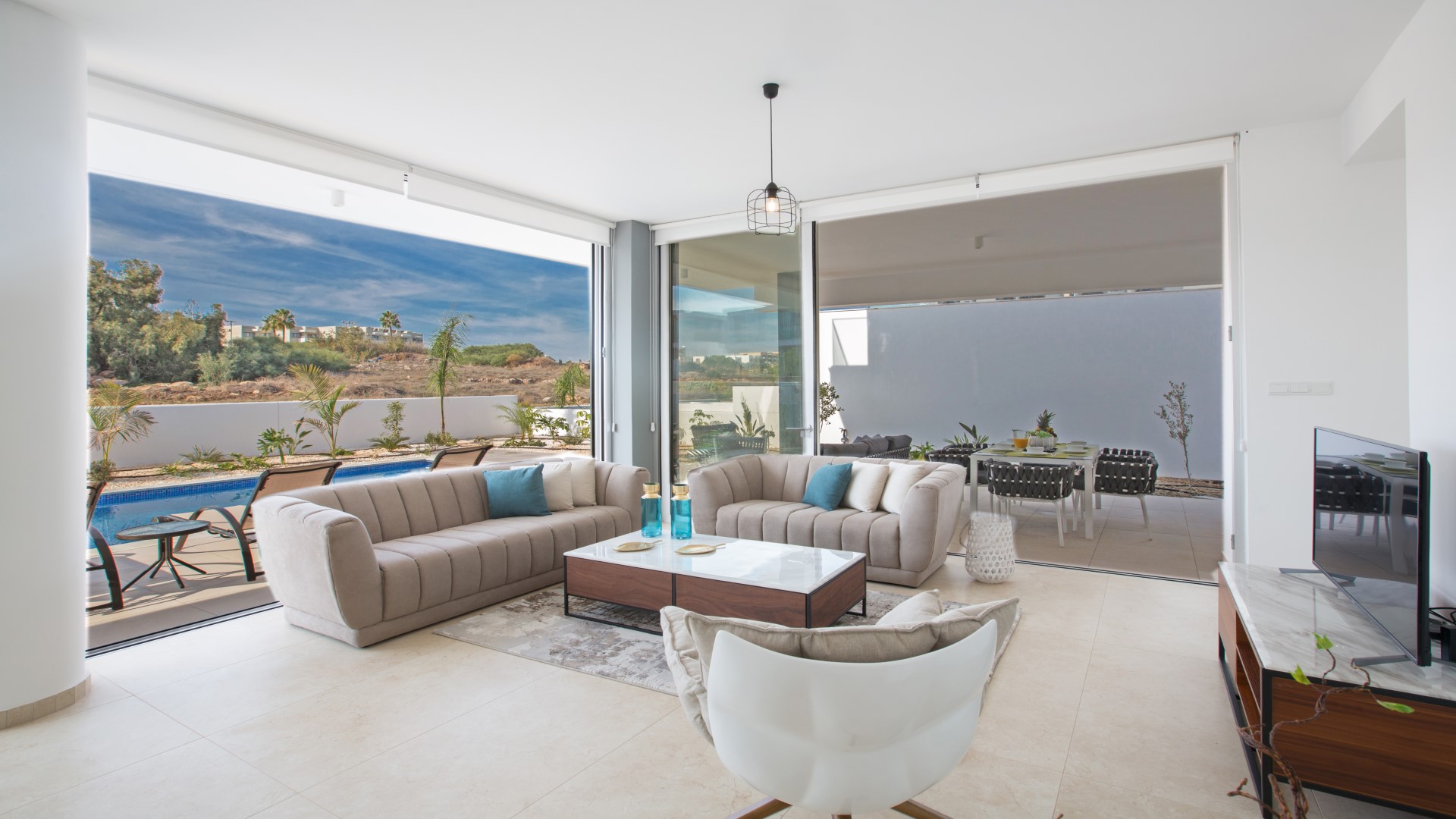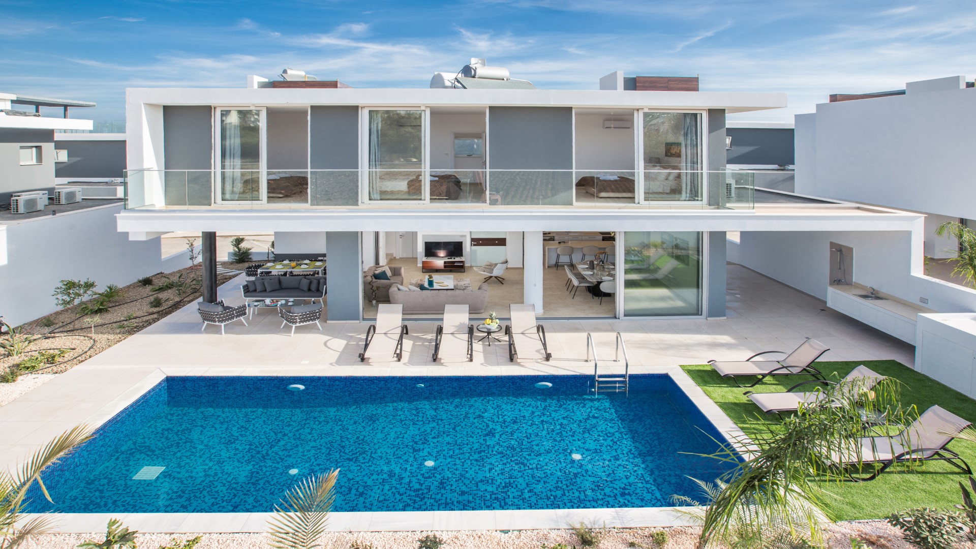 Outside, the spacious garden has been thoughtfully designed for outdoor living. Guests can enjoy a built-in barbecue area complete with worktop, sink and seating for al fresco dining, comfortable sun loungers, and a large private swimming pool — ideal for relaxing and soaking up the Cyprus sunshine.