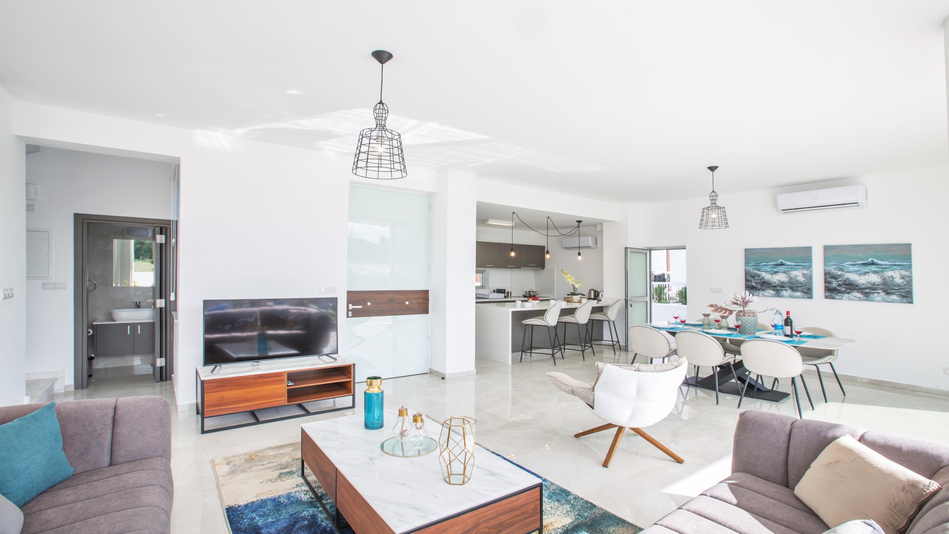 The villa’s spacious open-plan design brings together the living room, kitchen and dining area to create a bright and inviting space that makes excellent use of natural light. The living area is furnished with comfortable sofas and a widescreen TV with full satellite channels, while free Wi-Fi is available throughout the villa. The dining area comfortably seats up to 8 guests, and the modern, fully fitted kitchen is equipped with all appliances and utensils required for a high-quality self-catering stay, along with a convenient breakfast bar. Bi-fold patio doors surround the ground floor, opening directly onto the landscaped garden, barbecue and private pool area. A bathroom with shower and WC is also located on this level.