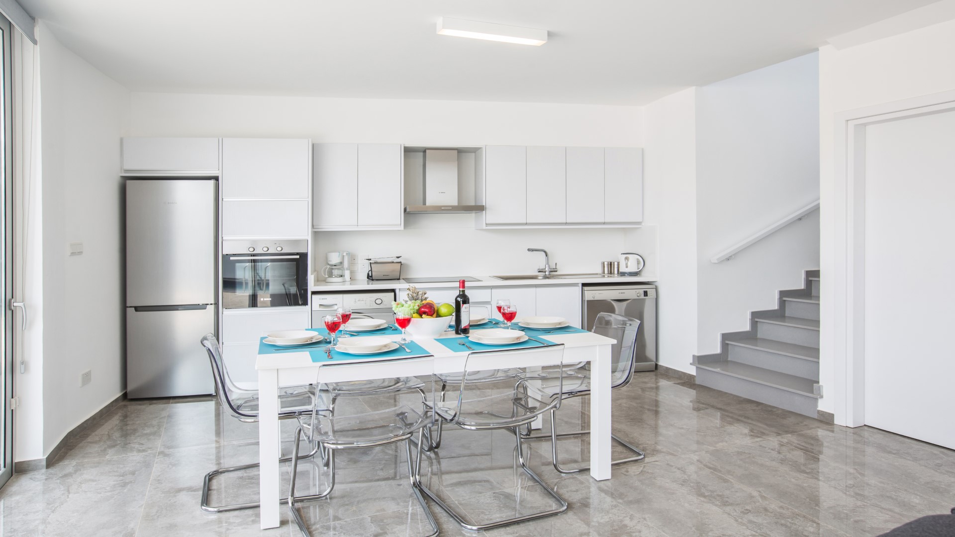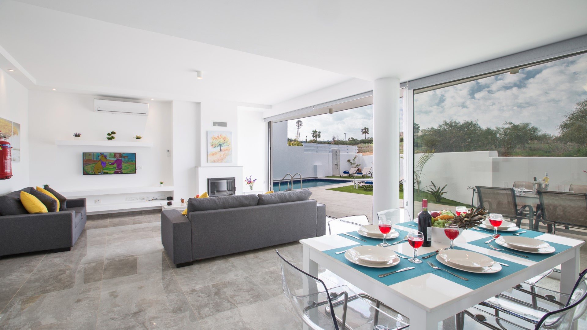 The villa features a bright and spacious open-plan layout that seamlessly combines the living room, kitchen and dining area, making excellent use of space and natural light. The living area includes a comfortable seating area, a widescreen TV with full satellite channels and free Wi-Fi throughout. The dining area seats up to 6 guests, while the modern, fully fitted kitchen is equipped with all appliances needed for a relaxing self-catering stay. Bi-fold patio doors surround the ground floor, opening directly onto the landscaped garden, outdoor kitchen, barbecue and private pool area. A WC is also conveniently located on this level.
