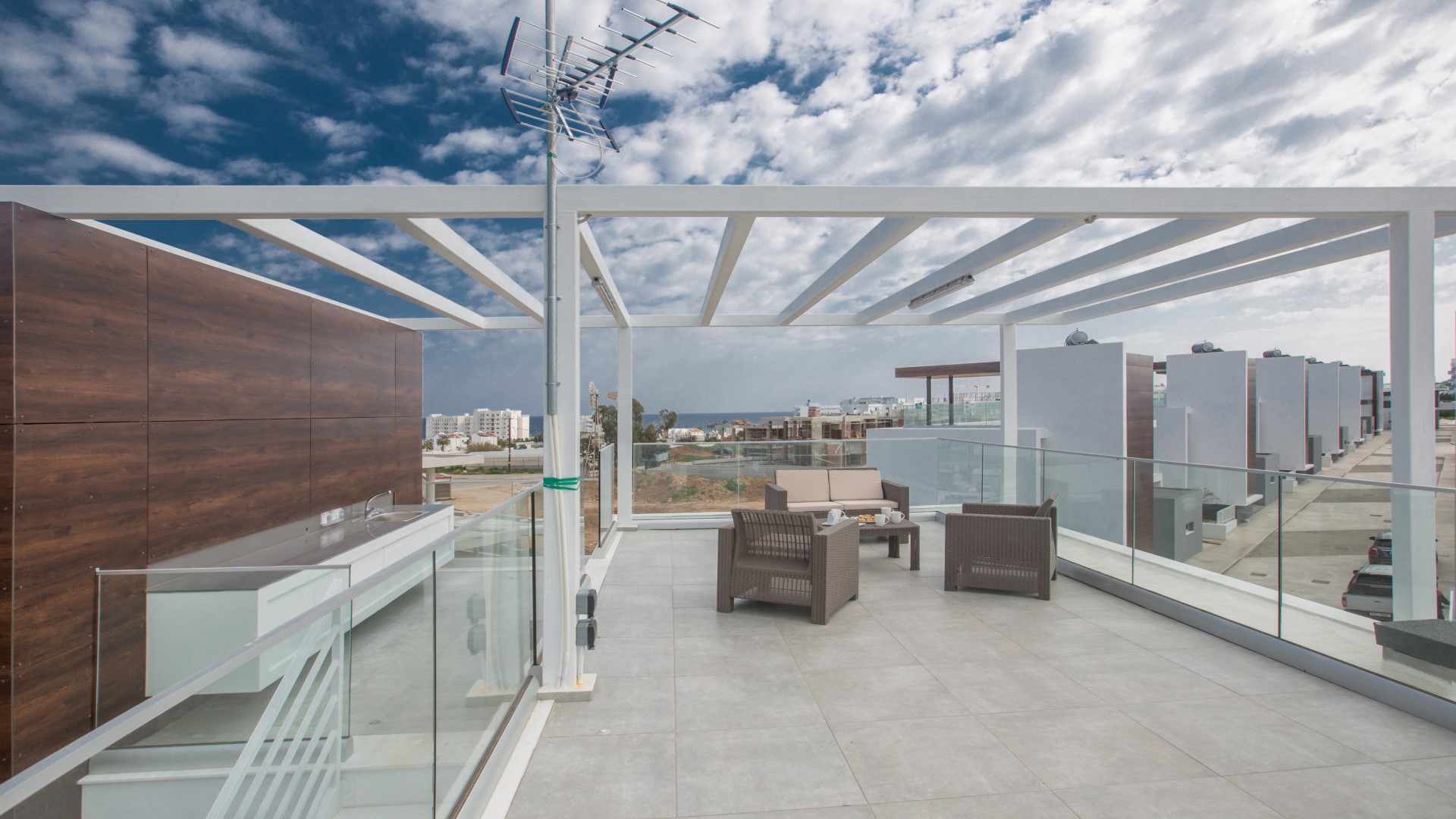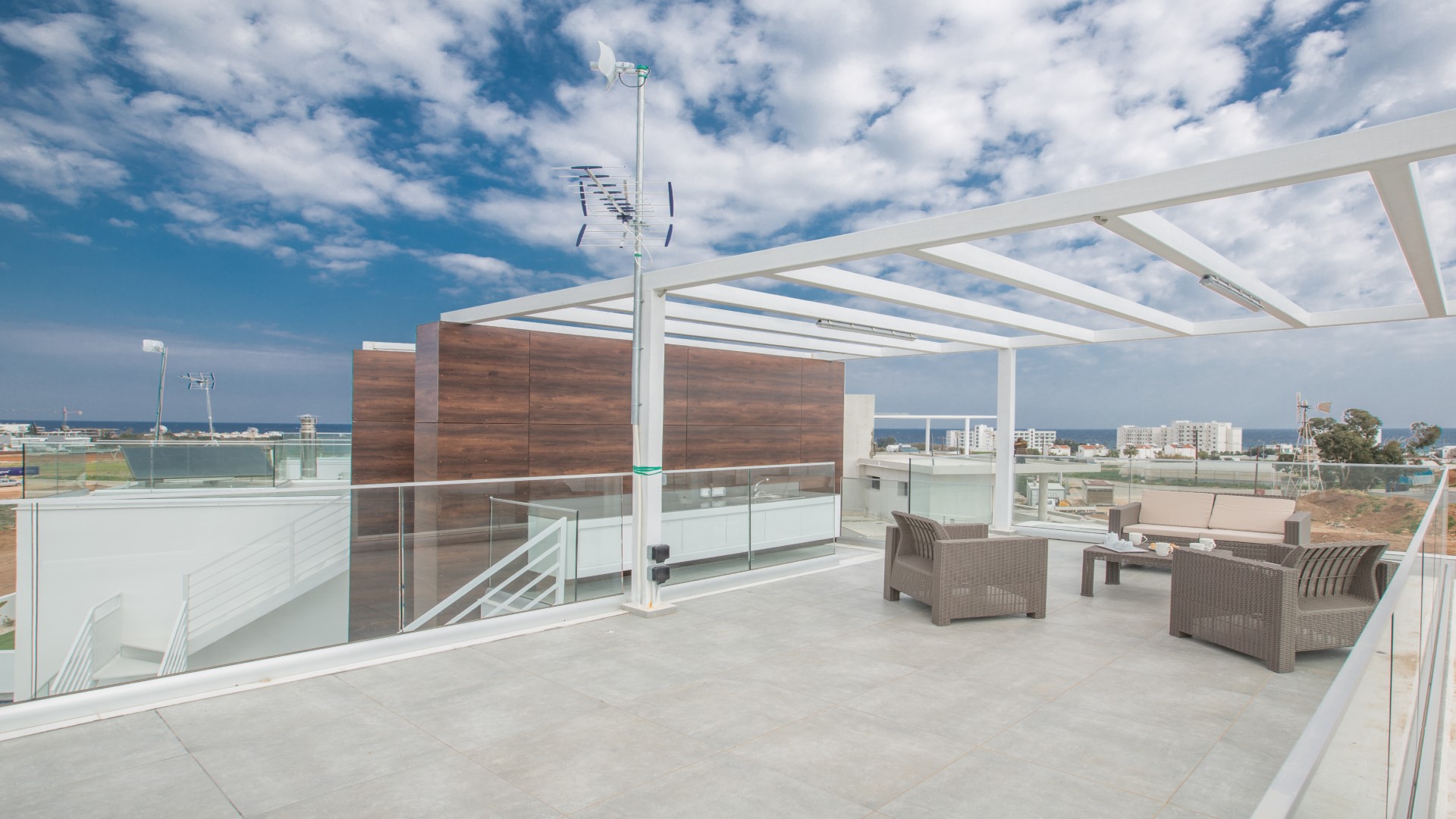 On the third level, the villa boasts a stunning roof garden with a built-in kitchen area. This elevated space is ideal for unwinding in the evening, enjoying beautiful sunsets and taking in the impressive panoramic views.