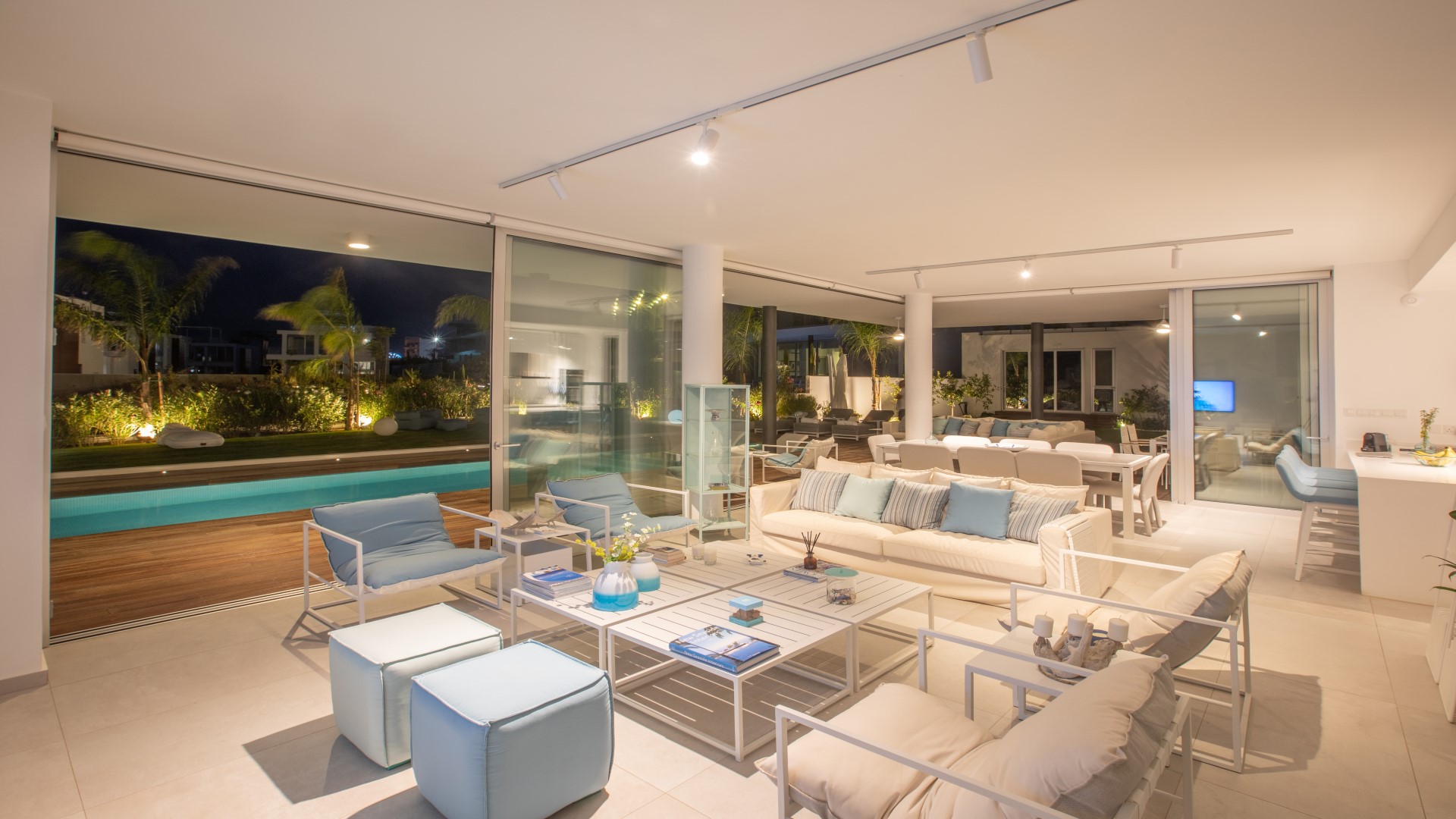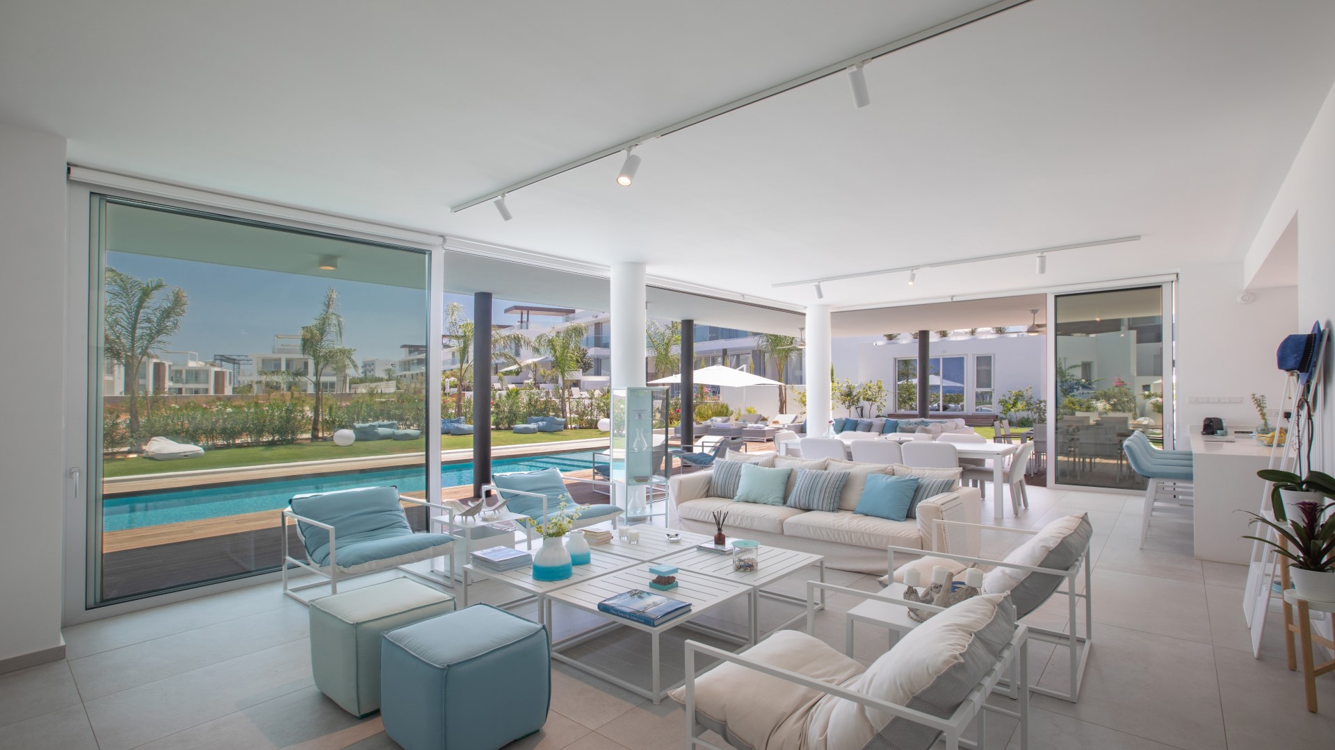 Upon entering the villa, you are immediately greeted by a grand and stylish open-plan living space that seamlessly combines the living room, kitchen and dining area. Bi-fold patio doors surround the interior, opening directly onto the landscaped garden and private pool area and allowing natural light to flood the space.