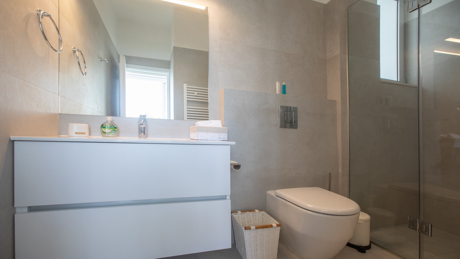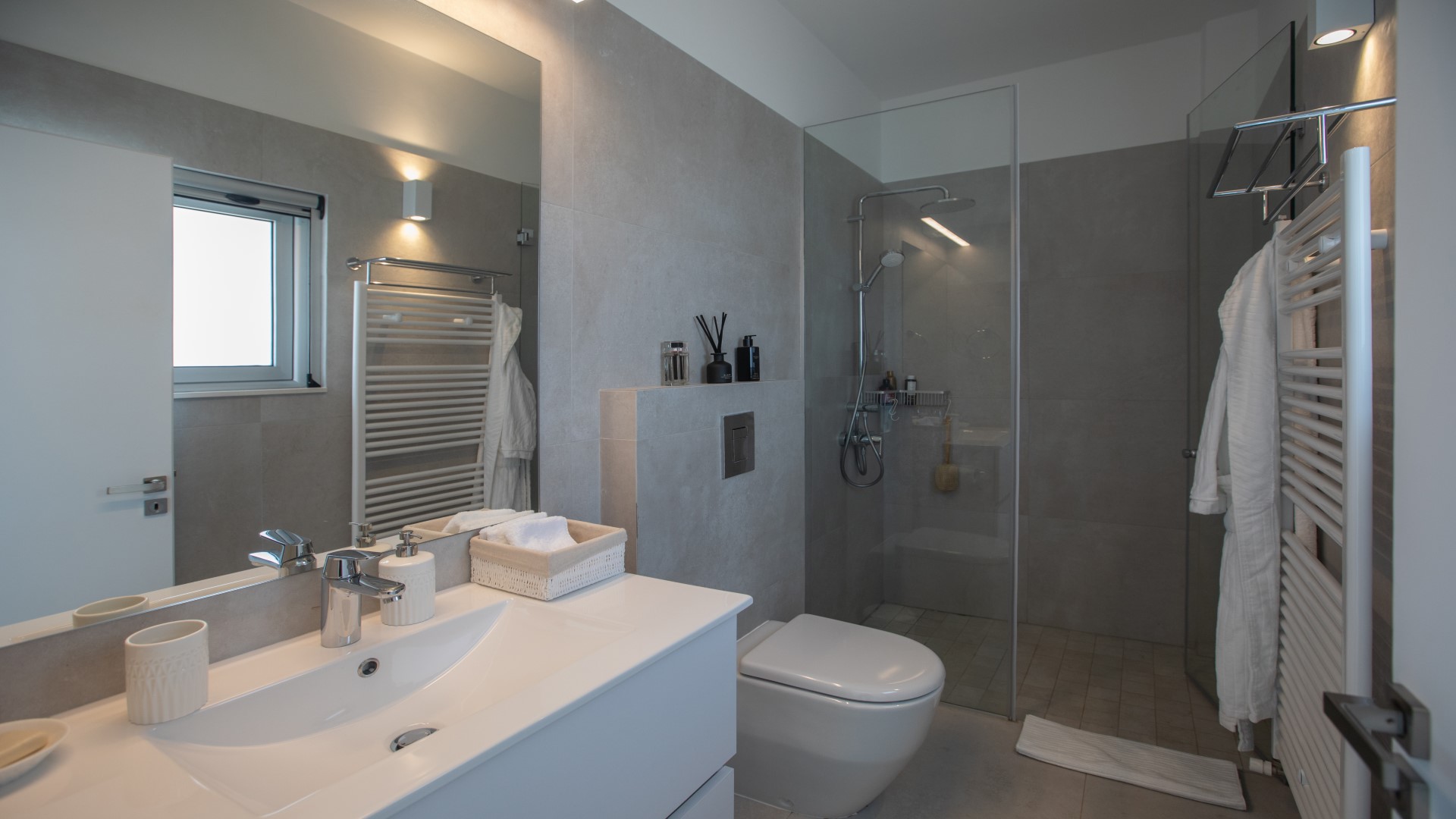 Upstairs, you will find the remaining three bedrooms, comprising one double bedroom and two twin bedrooms. Each bedroom benefits from its own en suite bathroom and opens onto a very large shared balcony, complete with a seating area and sun loungers — an ideal space for relaxing and enjoying the warm Mediterranean climate.