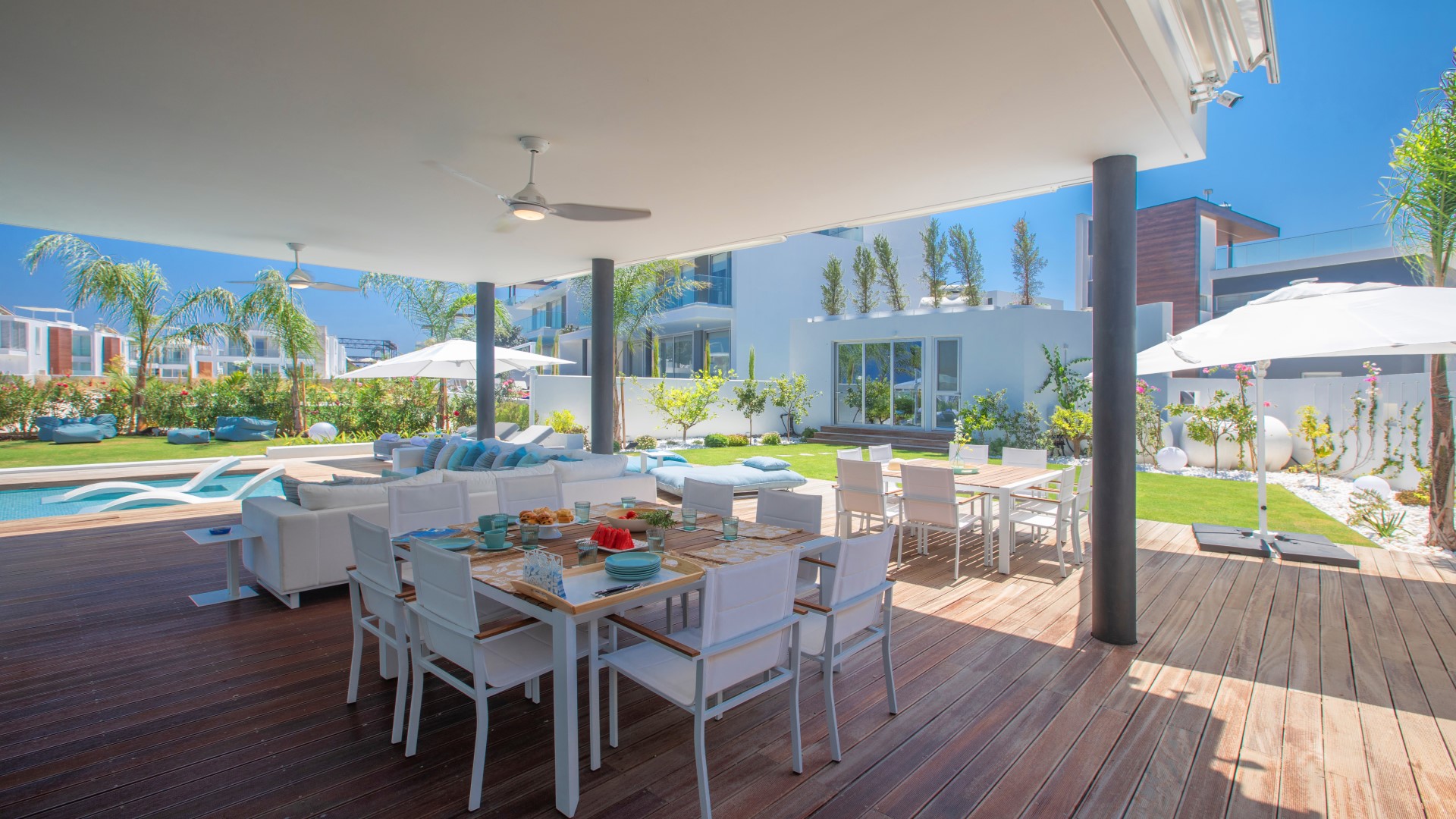 Outside, the expansive garden features modern decking and beautifully landscaped surroundings. Guests can enjoy a built-in barbecue, two outdoor dining areas, a comfortable corner sofa, sun loungers and a large private swimming pool — ideal for long, relaxing days basking in the Cyprus sunshine and indulging in the villa’s luxurious setting.