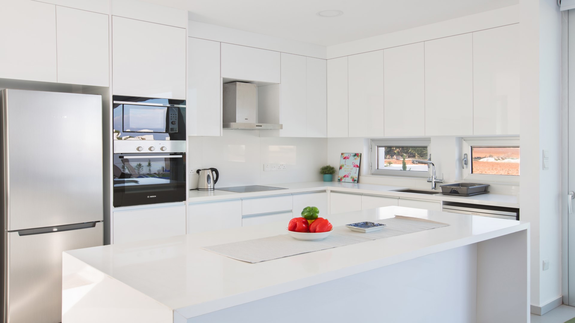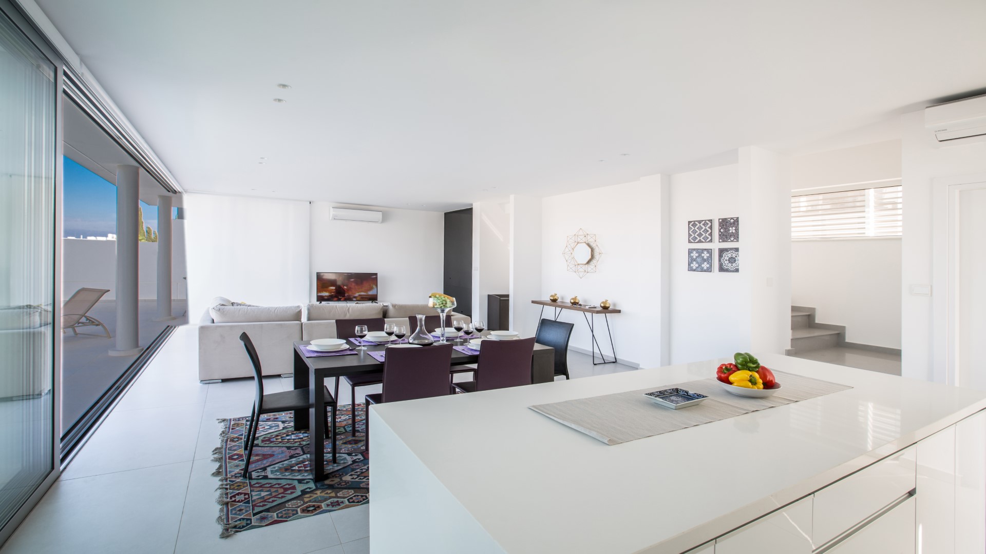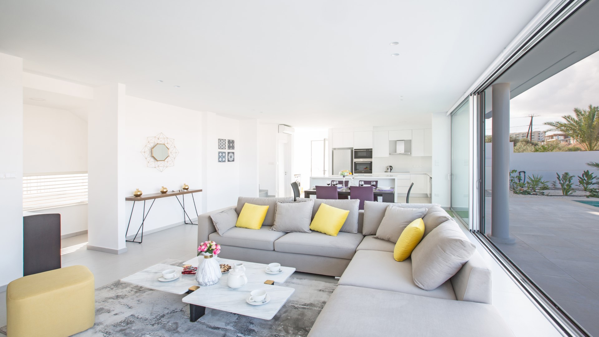 As you walk into the villa, you will find the open-plan living room, kitchen and dining area. The living room features comfortable sofas, a widescreen TV with satellite channels and Wi-Fi connection. The dining area offers seating for 6 people, and the modern kitchen is fully equipped with all appliances required for your self-catering stay, as well as a breakfast bar. The ground floor is surrounded by bi-fold patio doors that open out onto the garden and pool area.