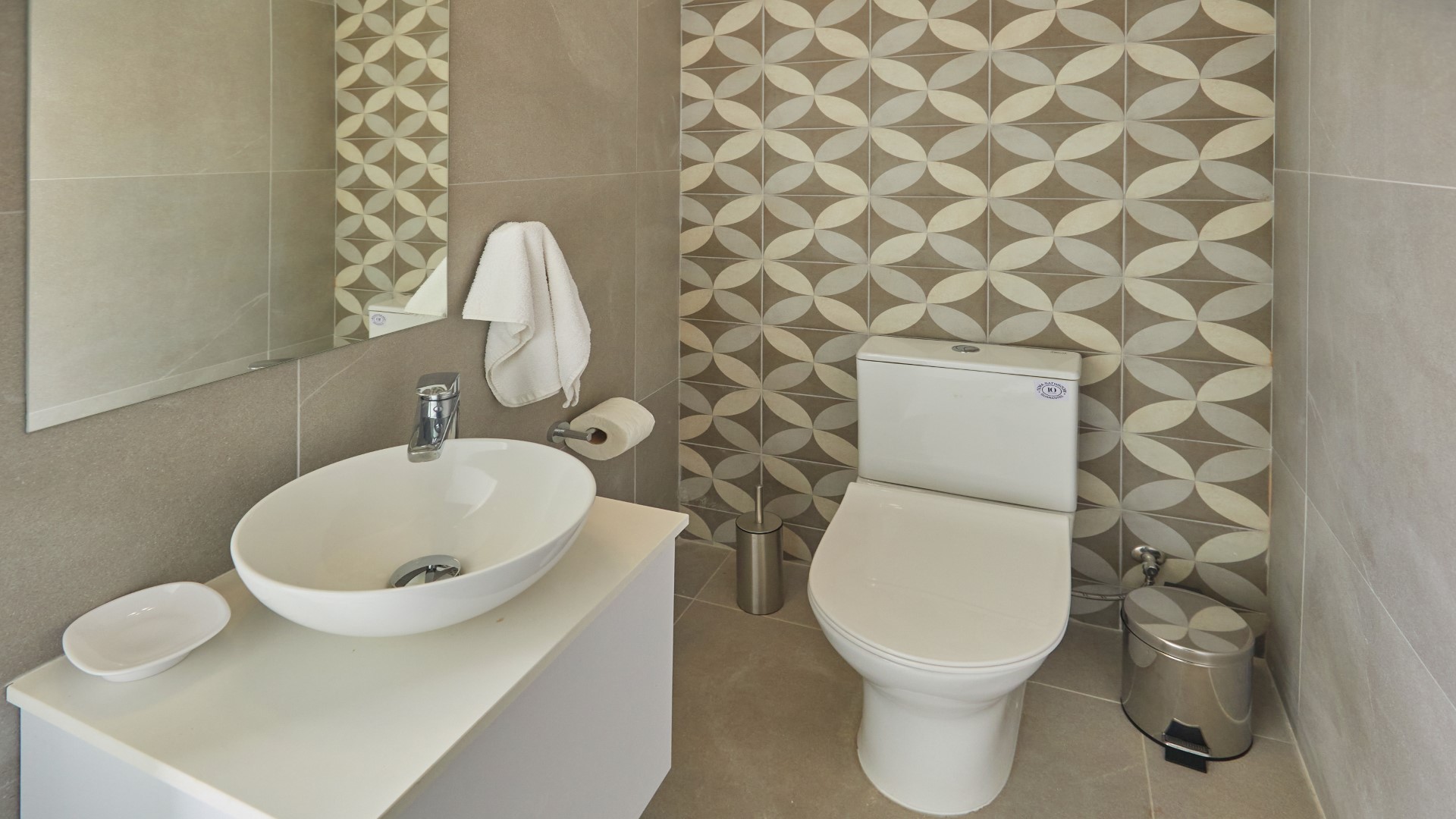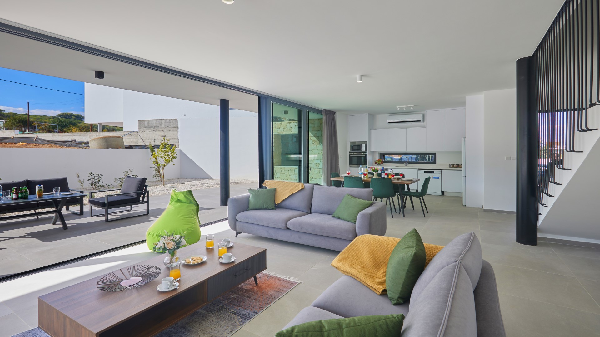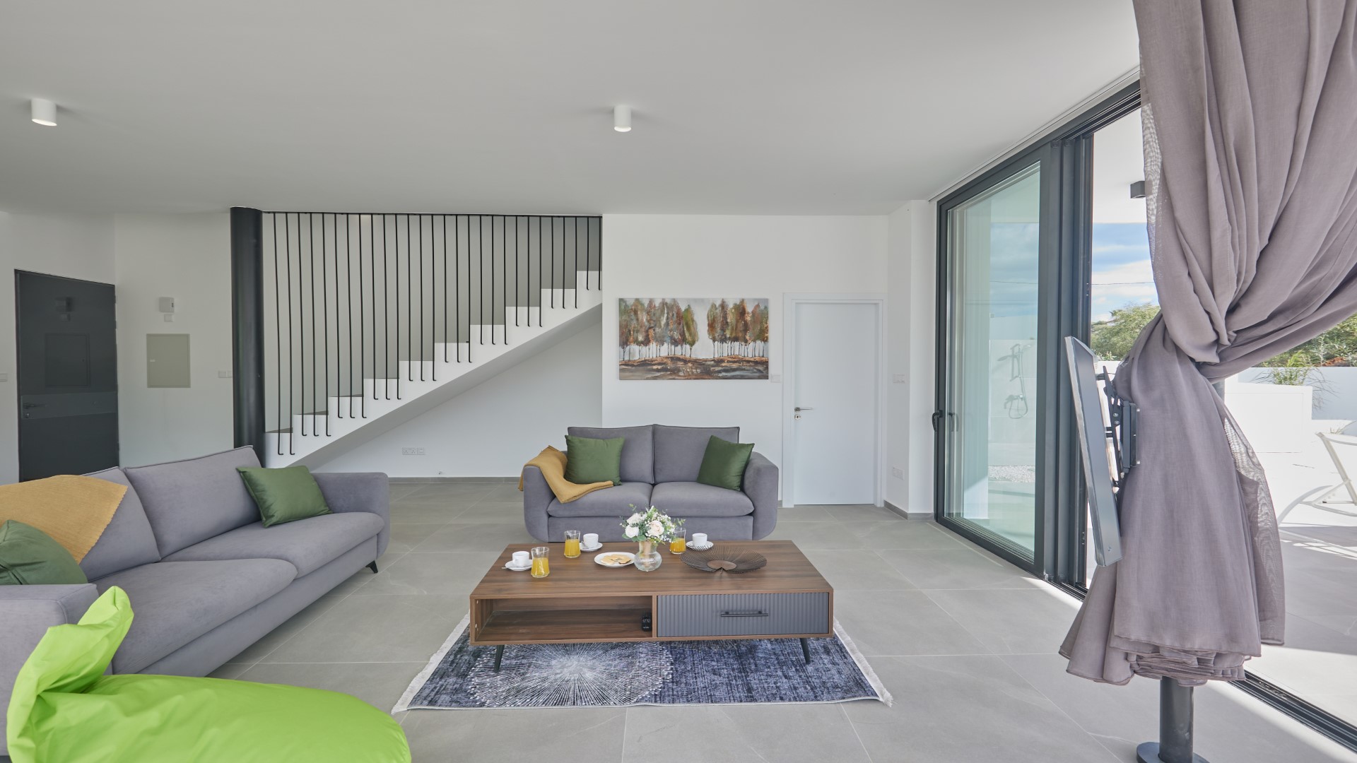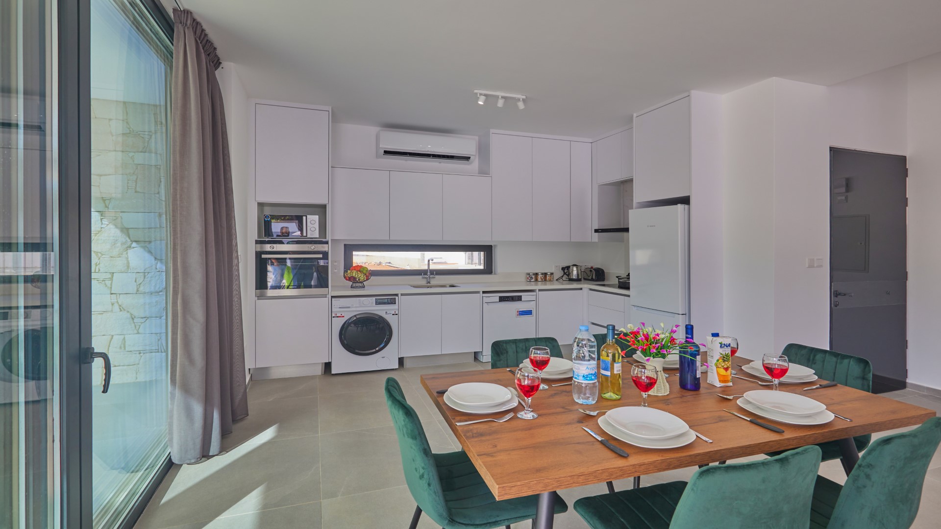 As you enter the villa, you will find the very stylish open-plan living room, kitchen and dining area, surrounded by patio doors leading out to the garden. The living room features a comfortable seating area and a Smart TV with satellite channels. The dining area includes a table and chairs to seat 6 people, and the kitchen is fully equipped with all utensils and appliances required for a comfortable self-catering stay. A WC is also located on this floor.