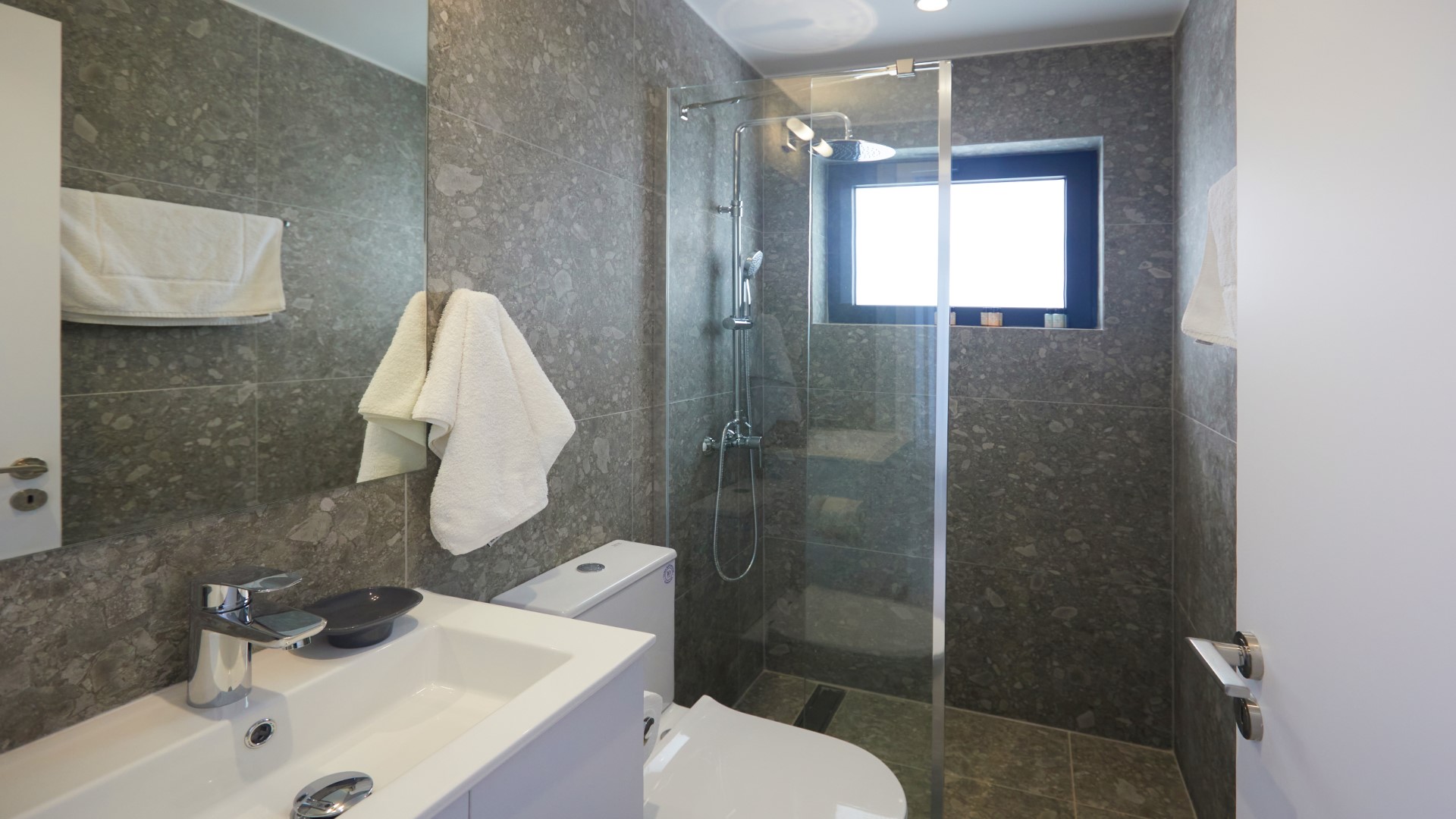 Upstairs, you will find all three bedrooms. The master bedroom offers a double bed, access to a private balcony, and an en suite bathroom with shower and WC. Bedroom two also features a double bed, while bedroom three has two single beds. All bedrooms are fitted with wardrobes and bedside cabinets. The main family bathroom with shower and WC is also located on this floor.