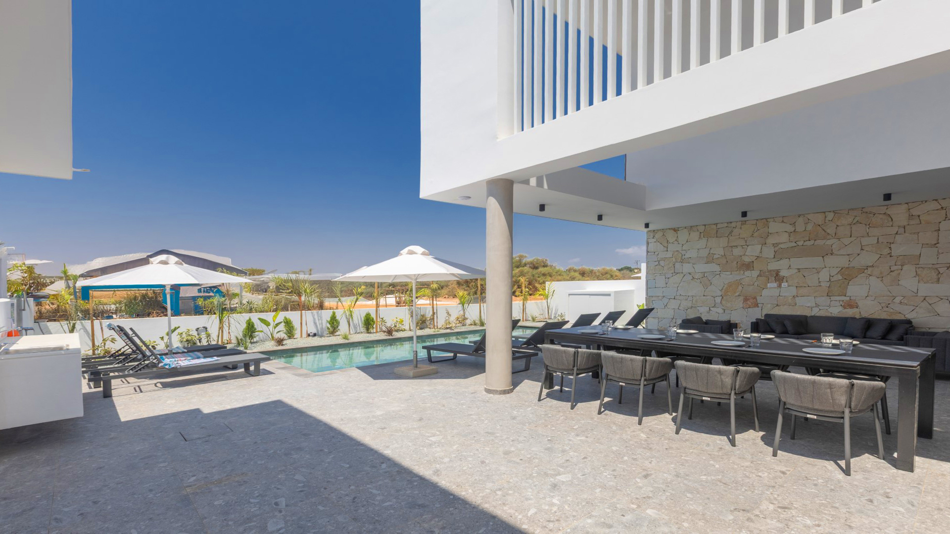 Outside, the beautifully designed and spacious garden provides an exceptional outdoor living experience. Guests can enjoy a barbecue area with worktop and sink, an outside shower, a large shaded dining area with seating for 10 people, and an additional lounge-style seating area with comfortable sofas. Sun loungers surround the large private swimming pool, making it the perfect place to relax and unwind under the Cyprus sun.