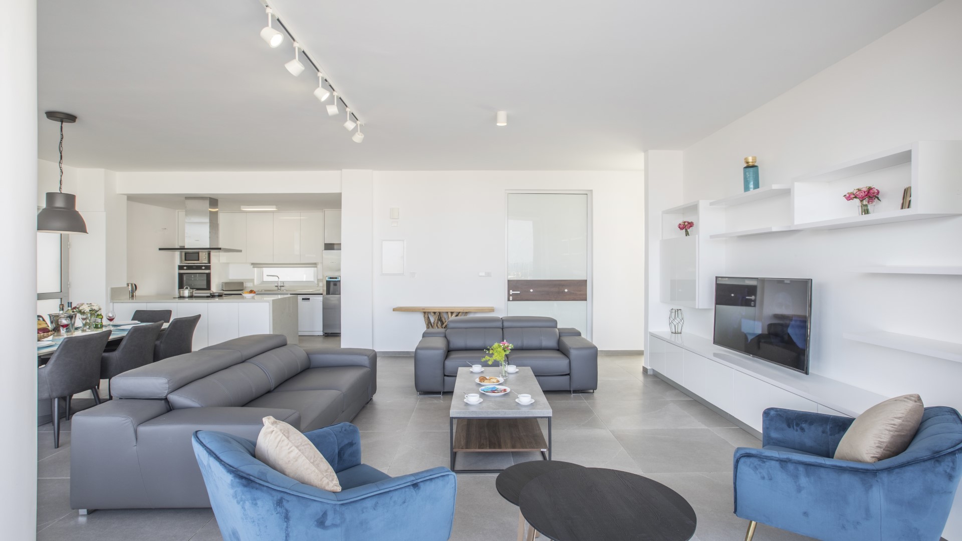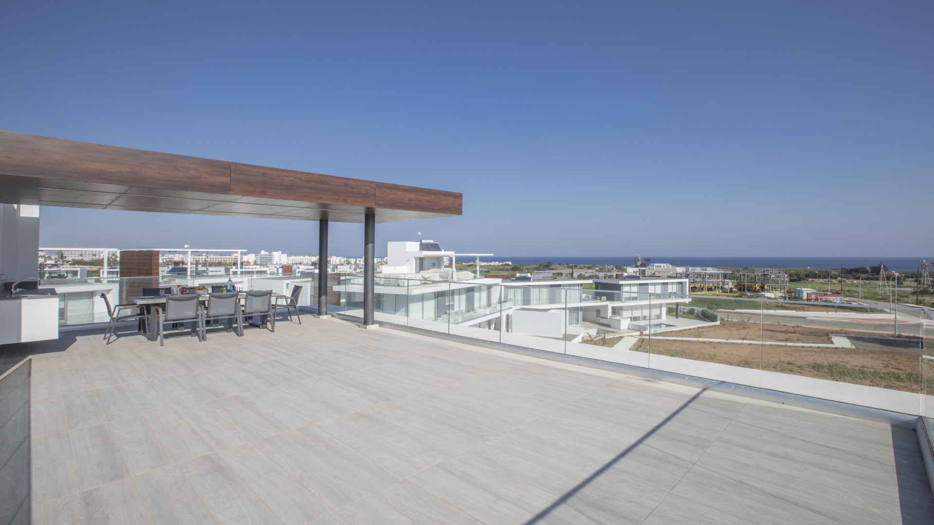 On the third level, the villa’s stunning roof garden provides an exceptional space to relax. Featuring a built-in kitchen area and covered seating, it is the perfect spot to unwind in the evening while taking in beautiful sunset views over the surrounding area.