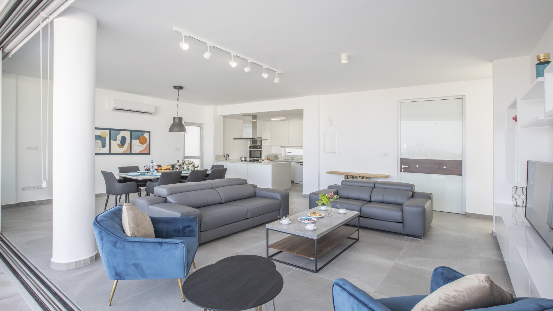 The outdoor space has been designed for both relaxation and entertaining. The spacious garden features a built-in barbecue with sink and worktop for outdoor cooking, a covered lounge area with comfortable sofas, sun loungers, and a large private swimming pool with easy-access steps — perfect for enjoying long, sunny days in Cyprus.