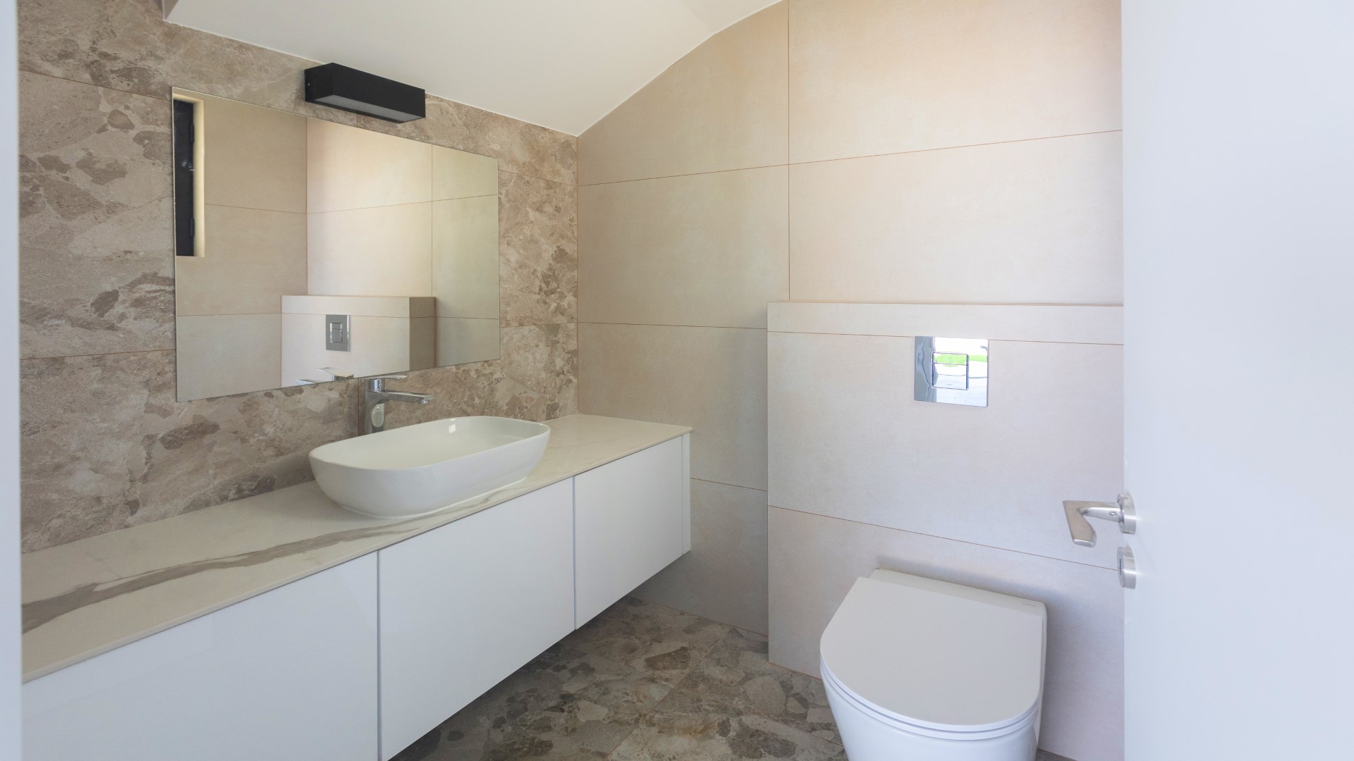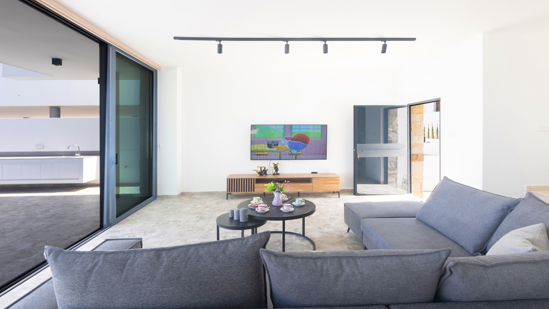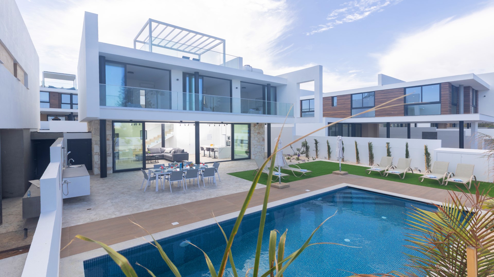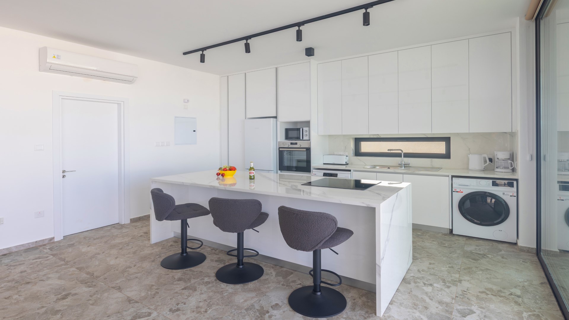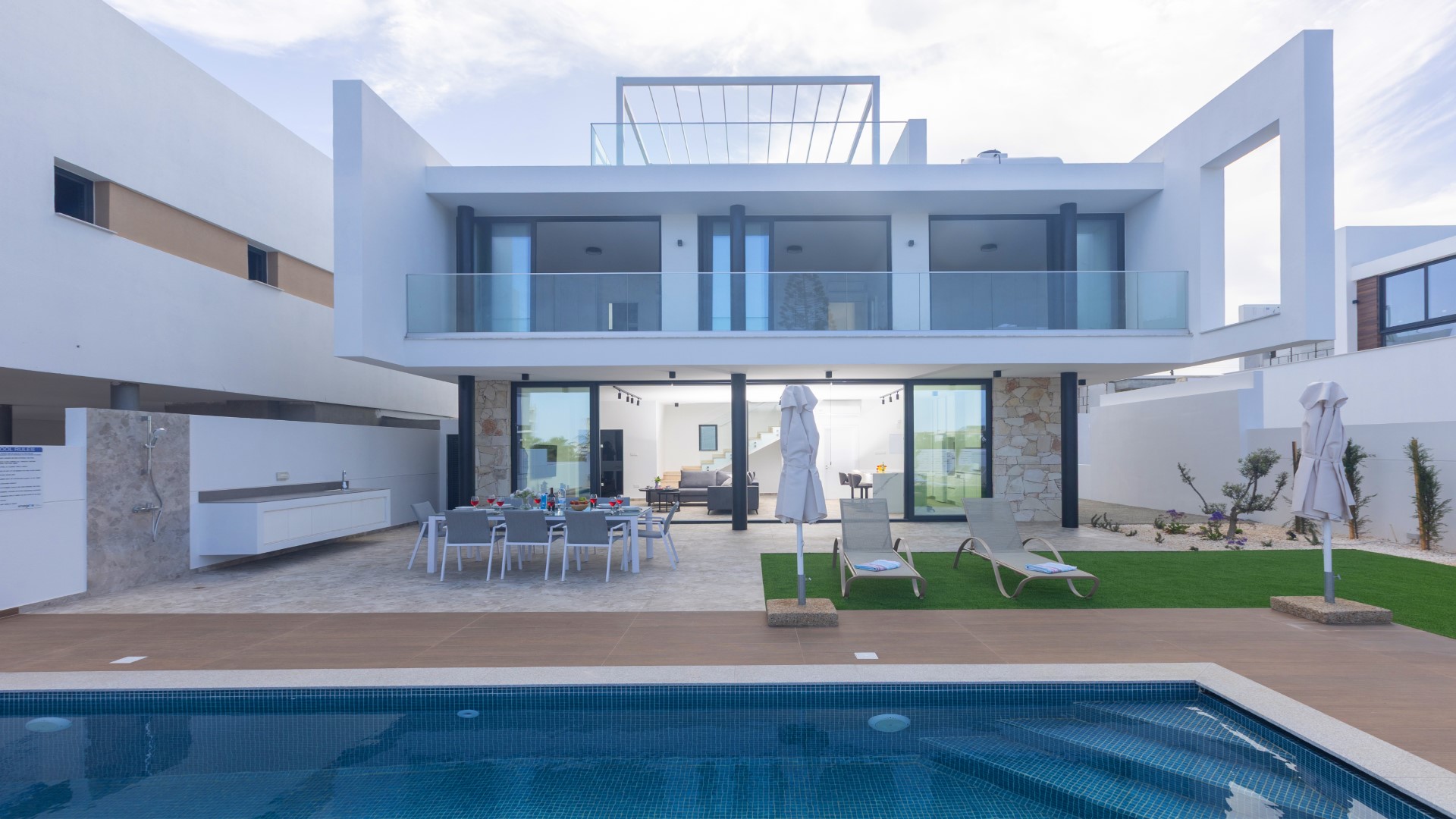 The villa features a spacious and beautifully designed open-plan ground floor, where the living room, dining area and fully equipped kitchen flow seamlessly together to create a bright and welcoming living space. Contemporary finishes, high-quality furnishings and generous natural light enhance the modern feel throughout. For added convenience, a shower and WC are also located on this level.