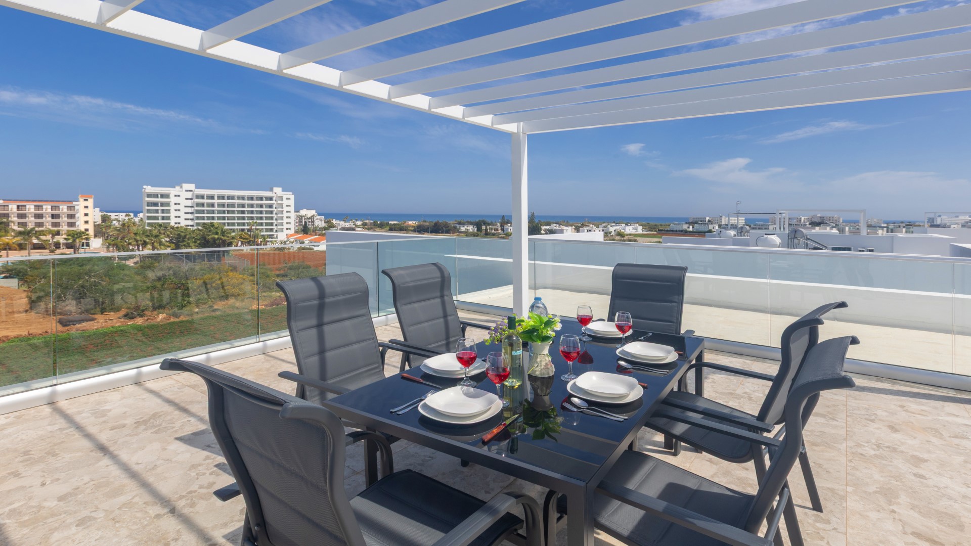Outside, guests can relax and unwind by the private swimming pool, perfect for enjoying long, sunny days in the Mediterranean climate. The villa also boasts a beautiful roof garden, offering panoramic views and a peaceful space to relax, entertain, or enjoy sunset drinks under the Cyprus sky.