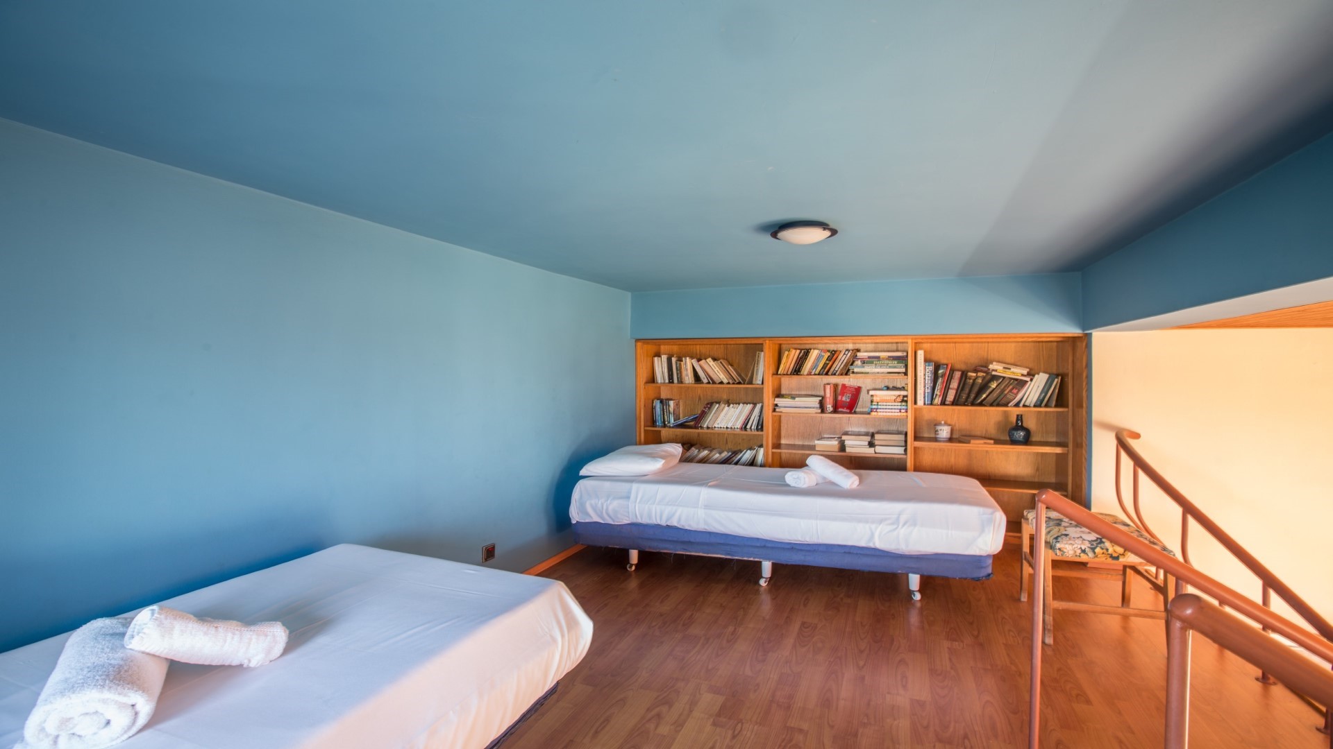 Upstairs, the villa offers a versatile and spacious family suite featuring a double bed, sofa, TV and en suite shower room, along with a mezzanine level that includes two additional single beds — all within the same open-plan space. This floor also includes two further double bedrooms, each with balcony access and stunning sea views. A separate utility room with washer, dryer and ironing facilities adds convenience, alongside a main bathroom complete with a corner bath and shower.