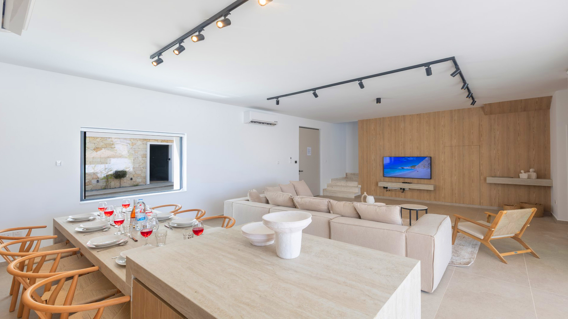 Upon entering the villa, you are welcomed into a bright and spacious open-plan living area that seamlessly combines the living room, kitchen and dining space. Large patio doors flood the interior with natural light and open directly onto the garden and private pool. The living room features a comfortable corner sofa, a widescreen Smart TV with satellite channels and Wi-Fi connection. The dining area comfortably seats up to 10 guests, while the fully equipped kitchen includes all appliances and utensils required for an enjoyable self-catering holiday.