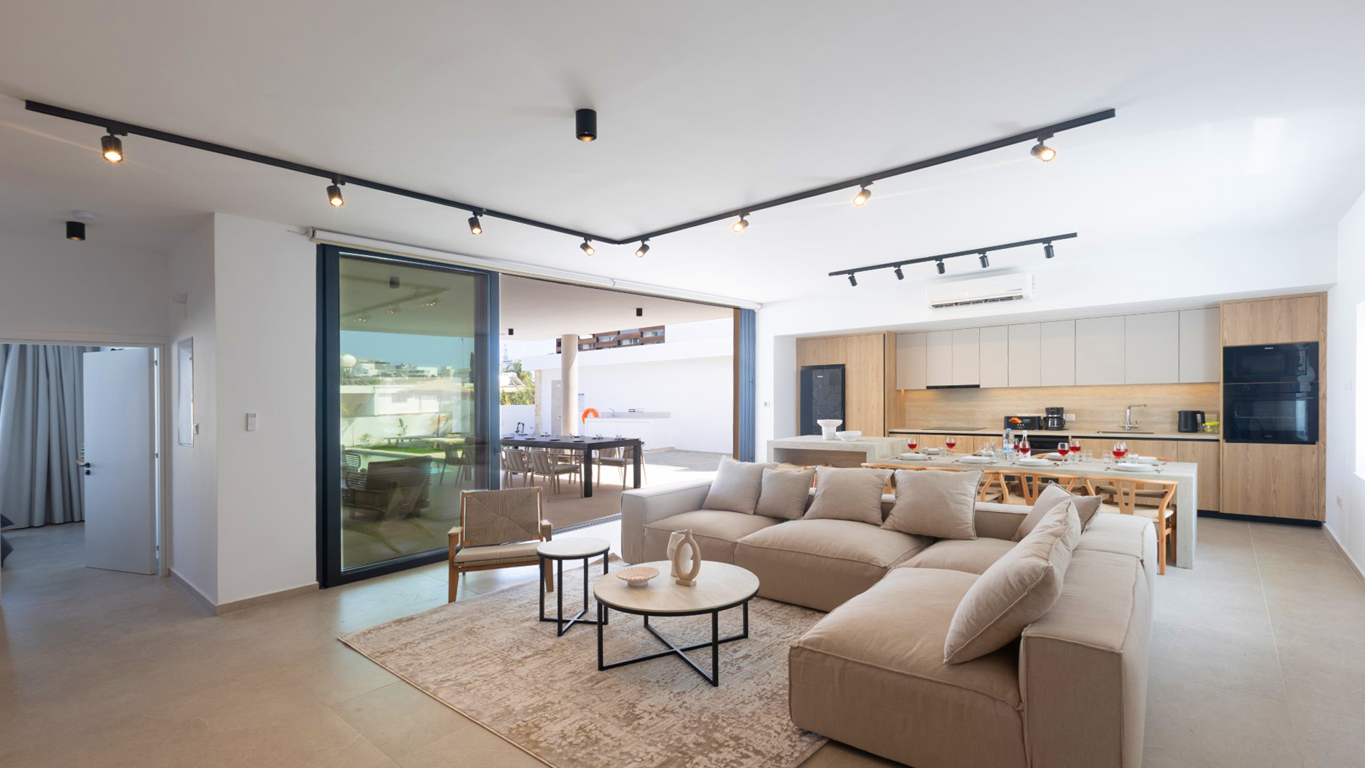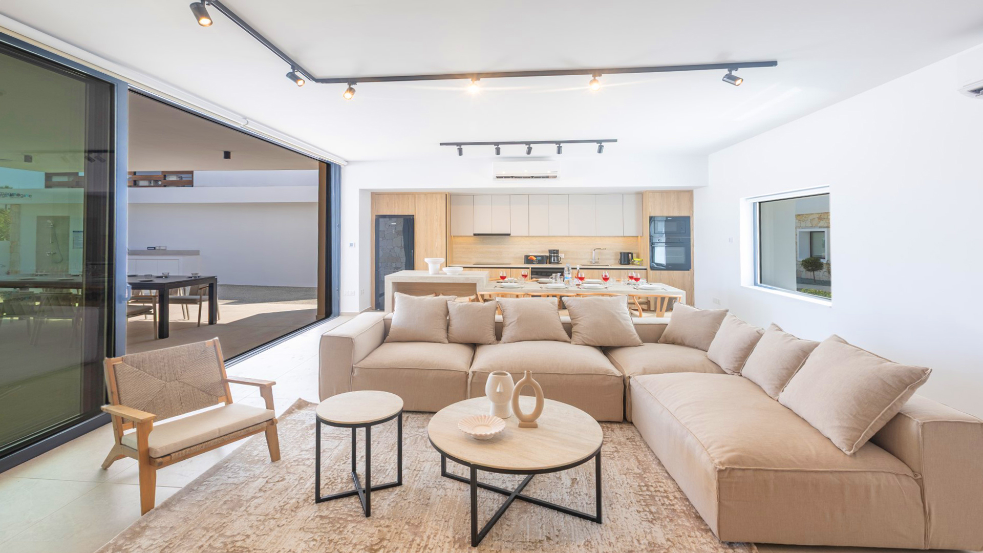 Upon entering the villa, you are welcomed into a bright and spacious open-plan living area that seamlessly combines the living room, kitchen and dining space. Large patio doors flood the interior with natural light and open directly onto the garden and private pool. The living room features a comfortable corner sofa, a widescreen Smart TV with satellite channels and Wi-Fi connection. The dining area comfortably seats up to 10 guests, while the fully equipped kitchen includes all appliances and utensils required for an enjoyable self-catering holiday.