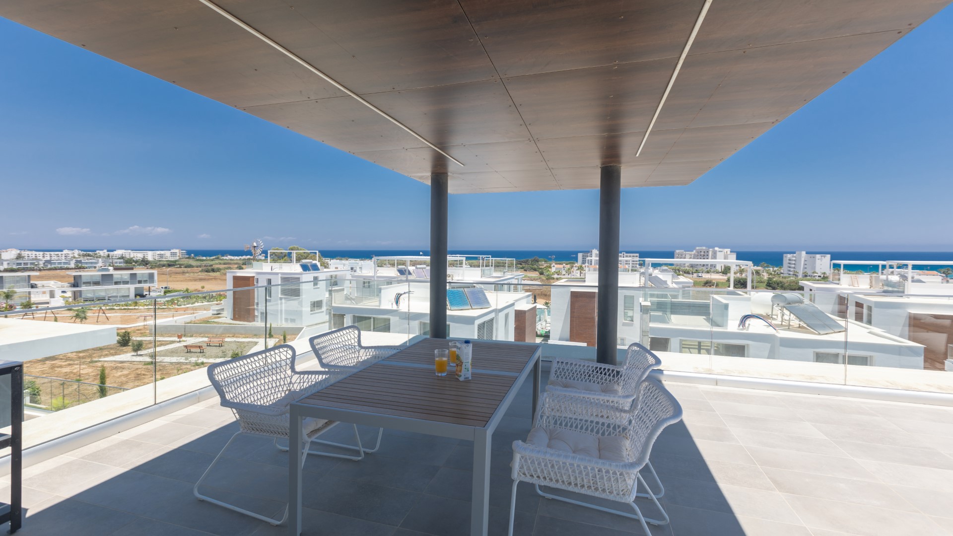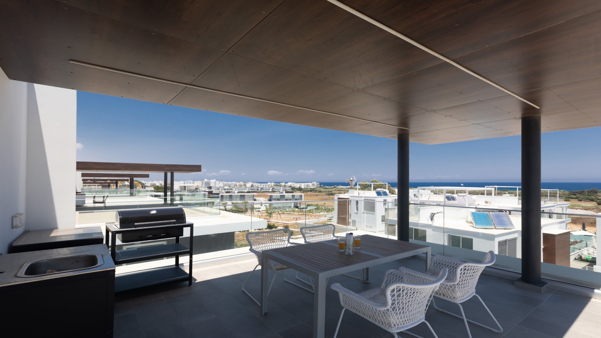 A true highlight of the villa is the impressive roof terrace, offering stunning sea views across Protaras. This elevated space features shaded lounge seating, a dining area and the added indulgence of a private hot tub, making it the perfect setting for relaxing evenings, sunset drinks and unforgettable moments.