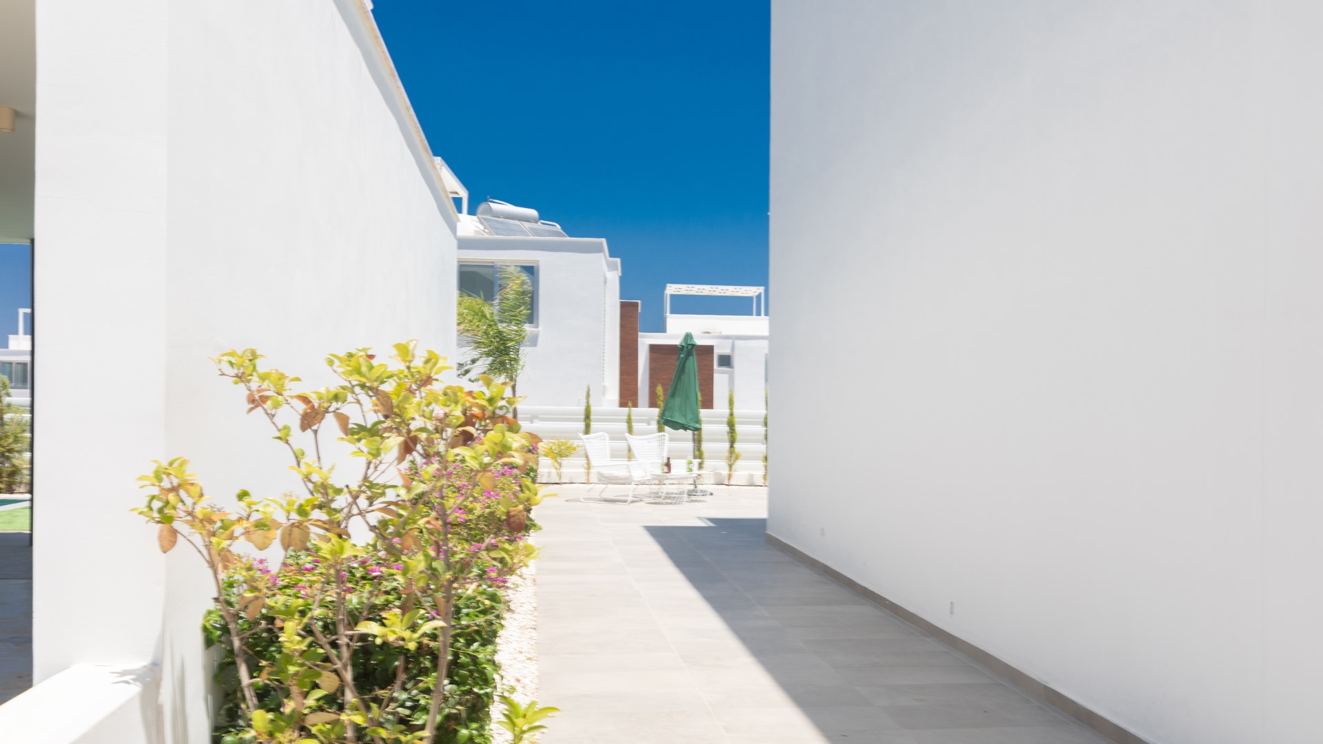 The upper floor hosts the remaining three bedrooms, comprising one double bedroom and two twin bedrooms. Each bedroom benefits from its own en suite bathroom and opens onto a large shared balcony, complete with seating and sun loungers — an ideal spot to relax and enjoy the warm Mediterranean climate.