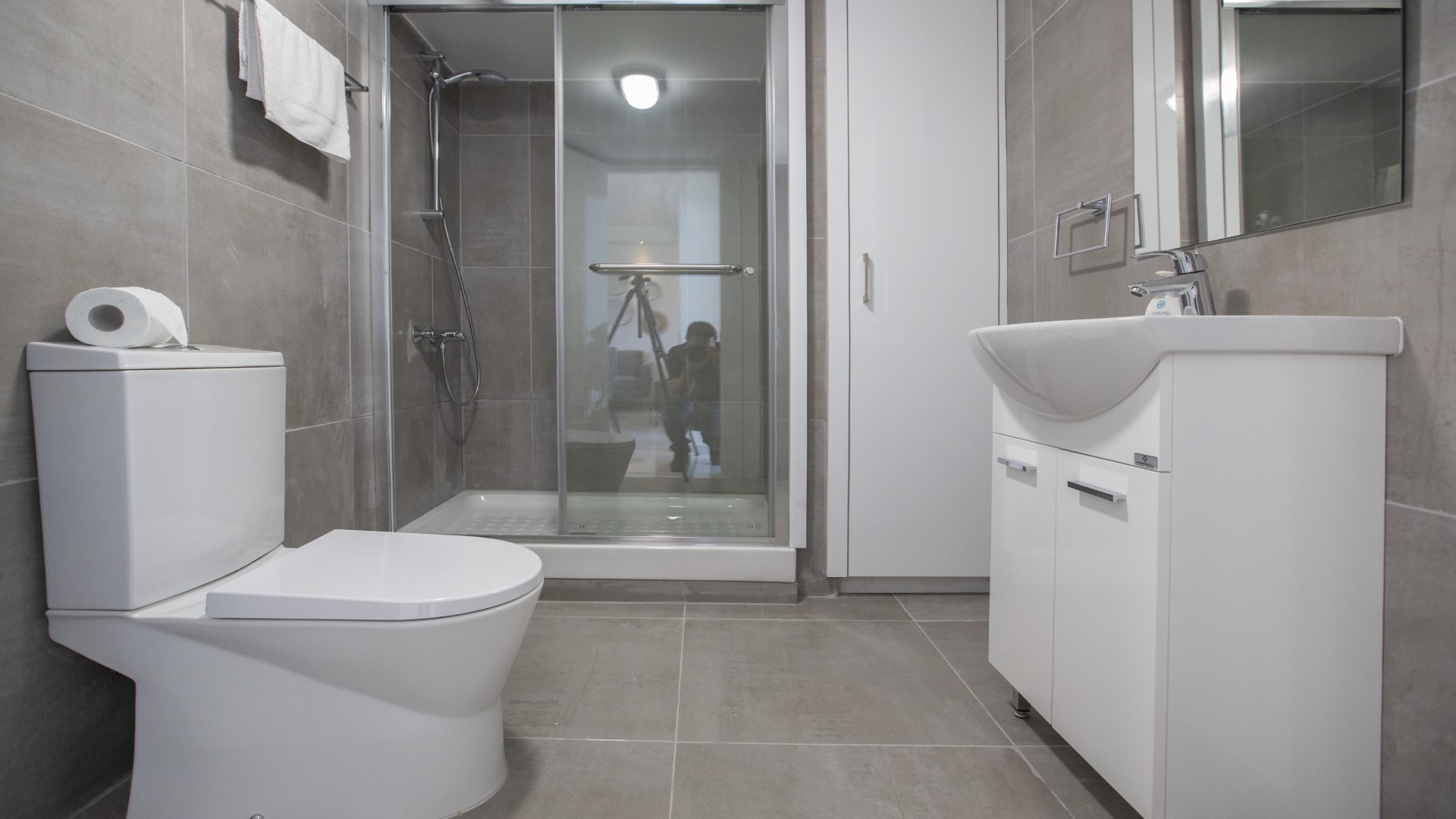 The modern main bathroom includes a stylish double shower, sink, WC and ample storage space, providing comfort and practicality throughout your stay.