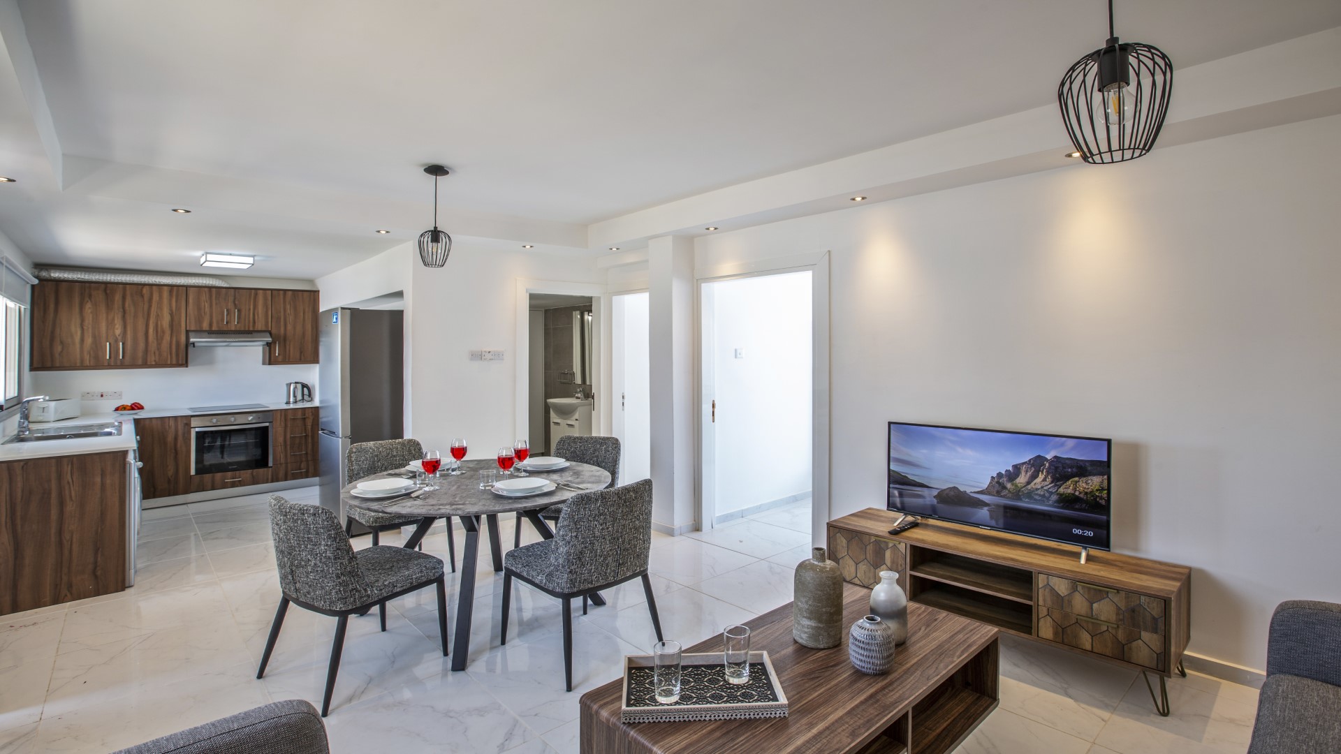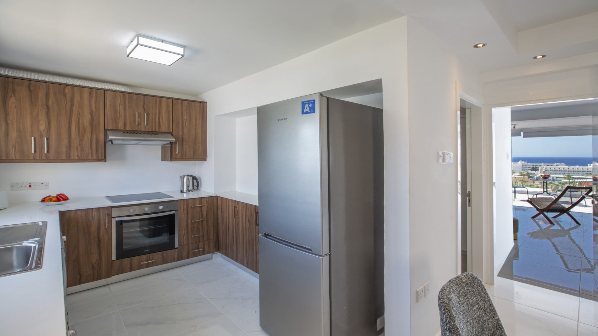 The apartment features a bright open-plan living and dining area with plenty of comfortable seating, creating a welcoming space to relax after a day in the sun. The fully fitted modern kitchen is equipped with everything required for a convenient self-catering stay, making it easy to prepare meals and snacks at your leisure.