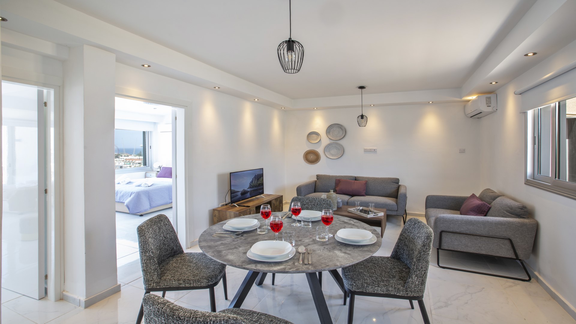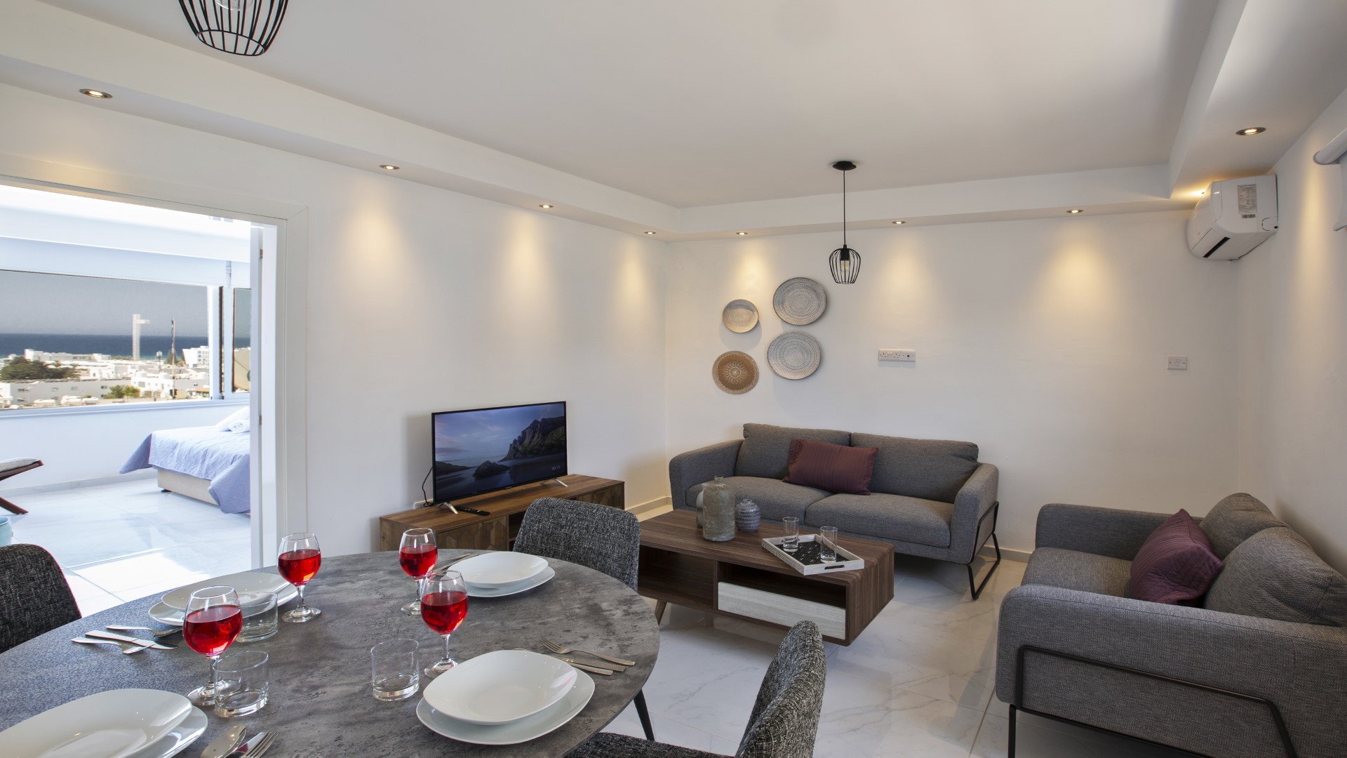 Outside, a large glass-fronted balcony offers the perfect spot to unwind while taking in the beautiful sea views — ideal for morning coffee, evening drinks or simply enjoying the Mediterranean breeze.