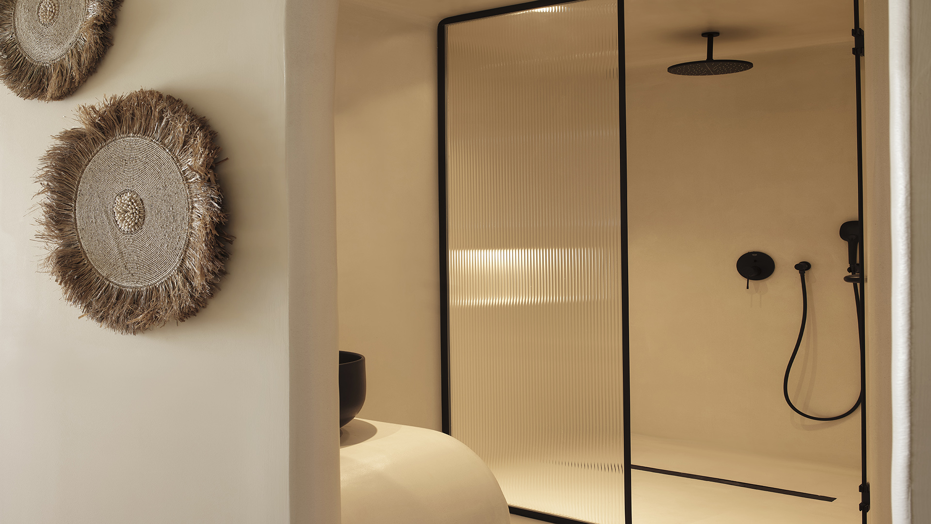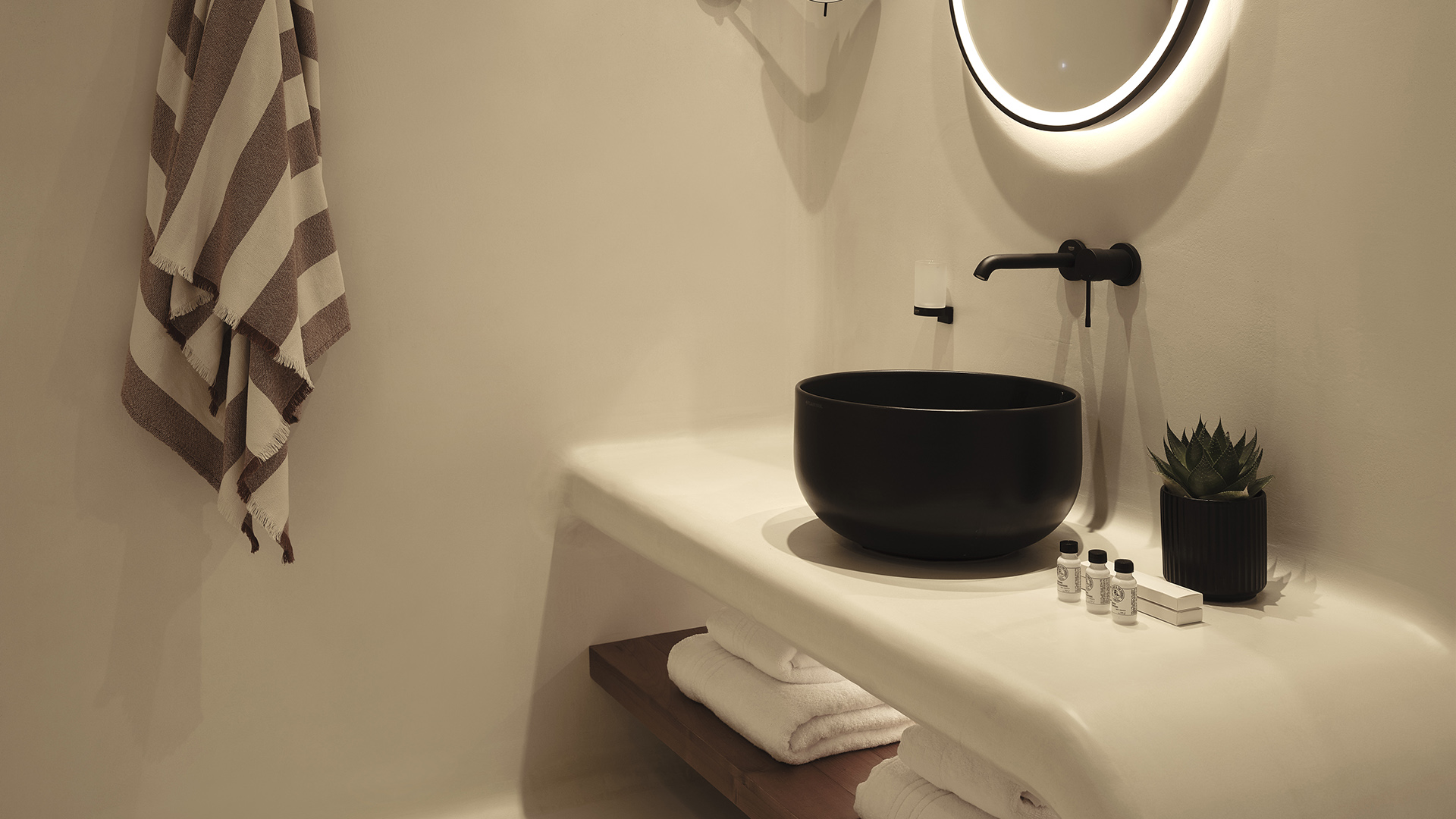 The modern bathroom is finished to a high standard, offering a walk-in shower, double hand basins and sleek, minimalist design touches that reflect the resort’s contemporary aesthetic.